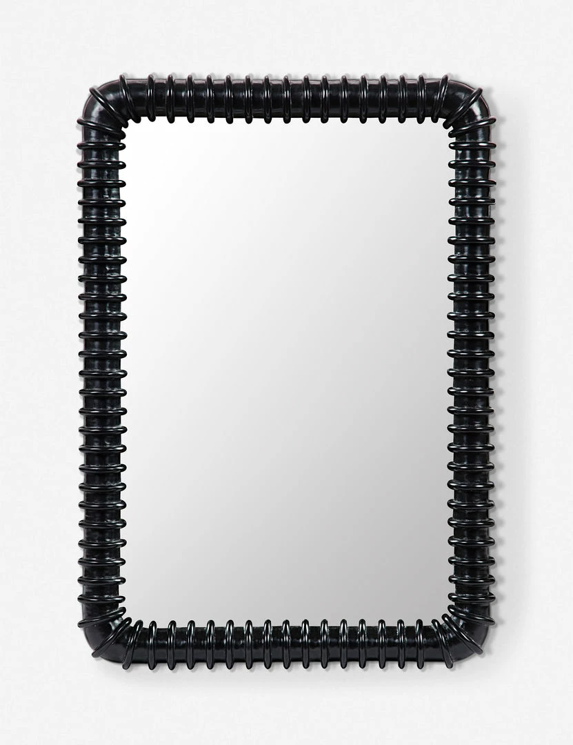 Rounded edges and raised rings characterize this mirror. A hand-rubbed finish in deep black brings a modern edge to the piece. Style in the bathroom with metallic sconces for a bold and glamourous look.