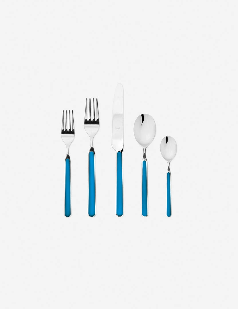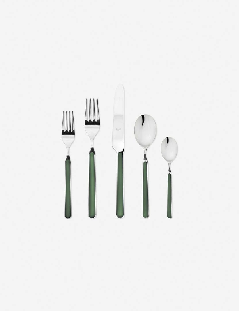 Featuring a glossy and colorful handle inlay, there is a vintage, Italian bistro charm to this 5-piece flatware collection by Mepra. Crafted from polished stainless steel and inlaid with glass resin, this set is a durable and sophisticated addition to your everyday dining table