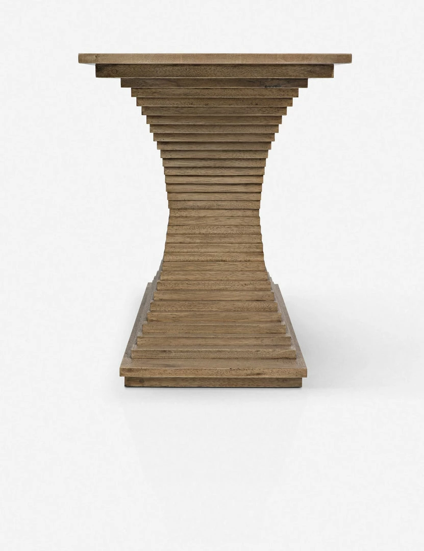 Stacked walnut pieces with a bleached finish lends this console table a layered, hewn look, while the curved design adds depth and movement. Place this piece in your entryway and decorate with minimal accessories or use it as a sideboard in your formal dining space.
