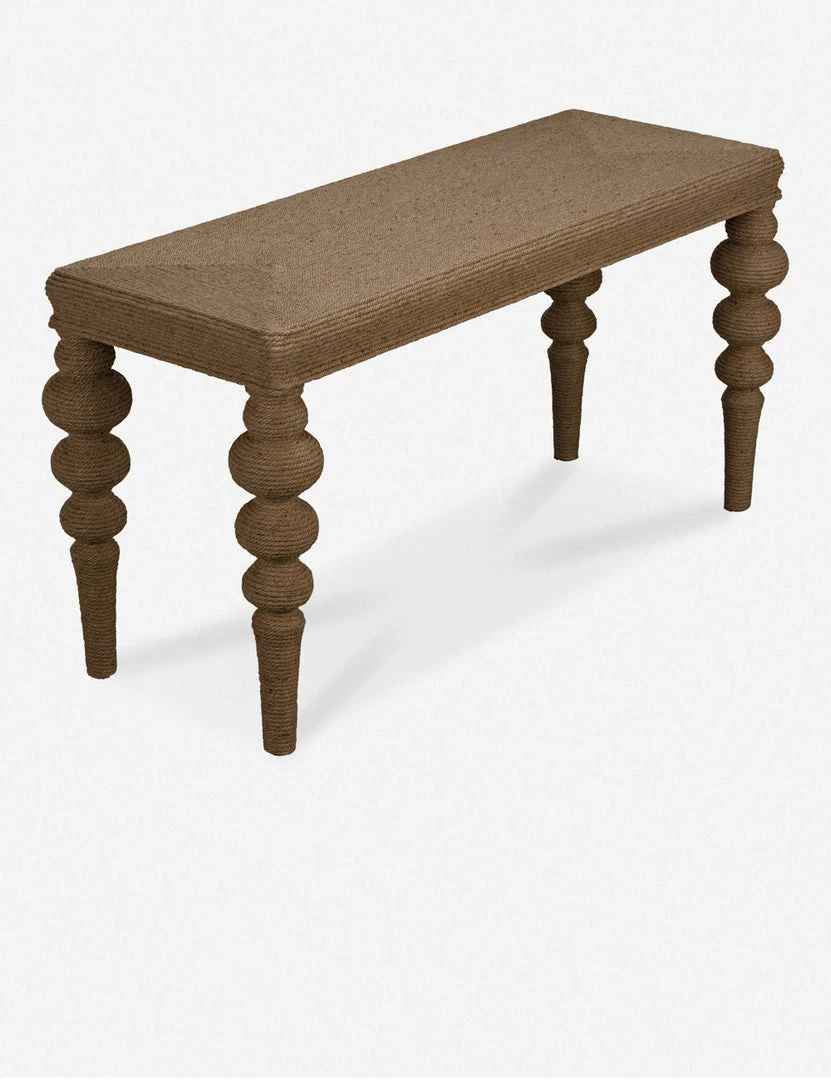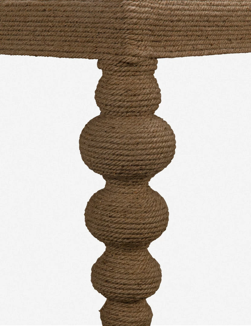 A traditional console silhouette features a solid elm construction with turned legs all wrapped in rope for timeless appeal with a textural twist. This tactile sofa table offers the perfect layer of artisan character to ground your living room or entryway decor.