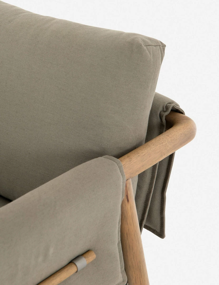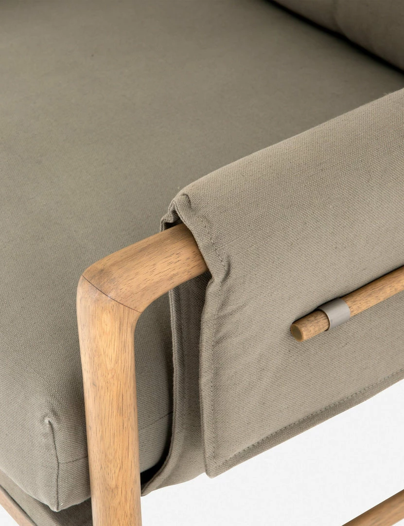 Details certainly elevate this accent chair’s look, with decorative toggles fastening its plush, light olived-toned upholstery in place. The tactile and comfortable cotton-blend upholstery wraps around the seat and arms of the show wood frame to lend this chair a mid-century-inspired look.