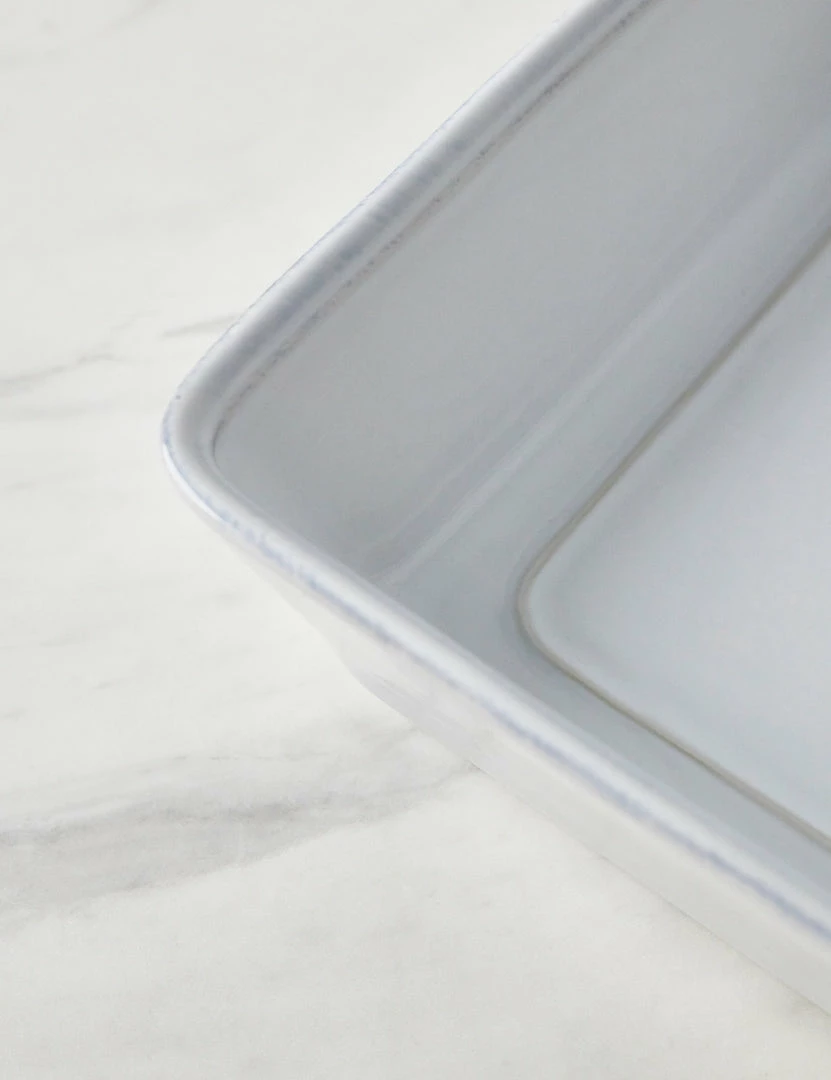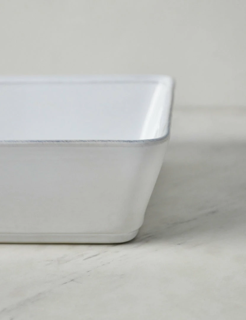 Refined lines, versatile design, and durable stoneware construction make the Friso dinnerware collection a favorite, from fine dining to everyday eating. The grooved edge is hand-painted for an artisanal touch that will fit perfectly into your carefully curated home decor. In a crisp white finish, this baking dish is an elegant and handy kitchen accessory.