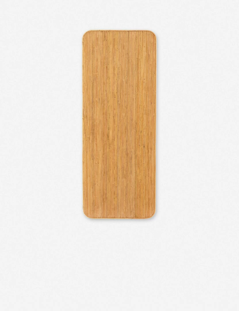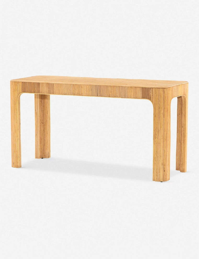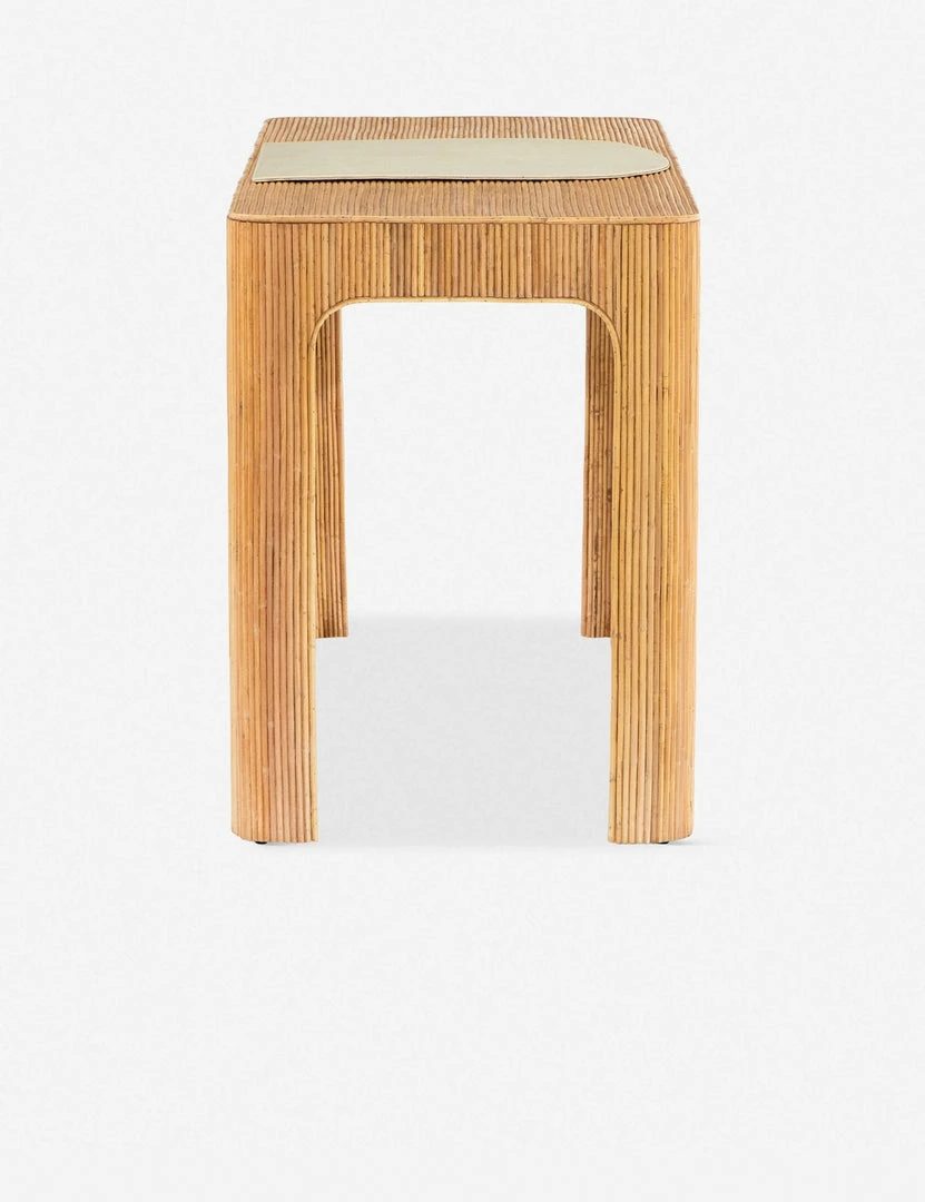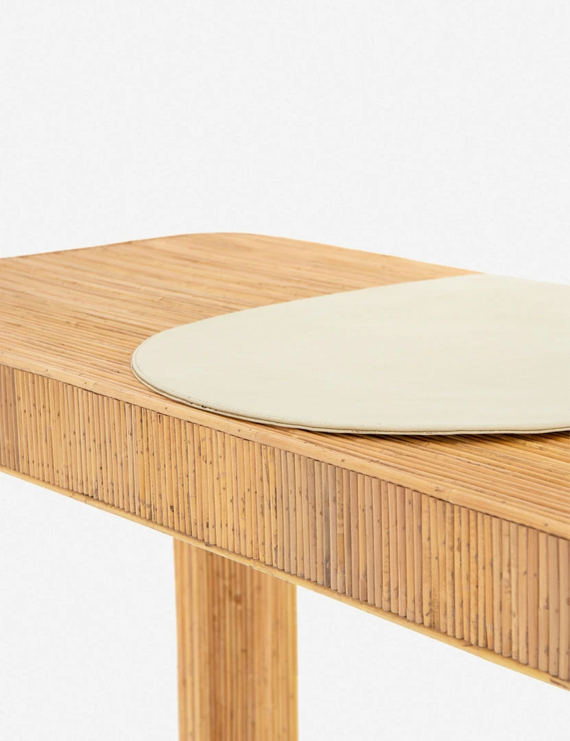 Taking a page from ’70s Italian villas, this sturdy desk features vertical rattan caning for a high-texture finish. Complete with a removable cream leather pad, it provides a smooth, stylish workspace for any transitional office.
