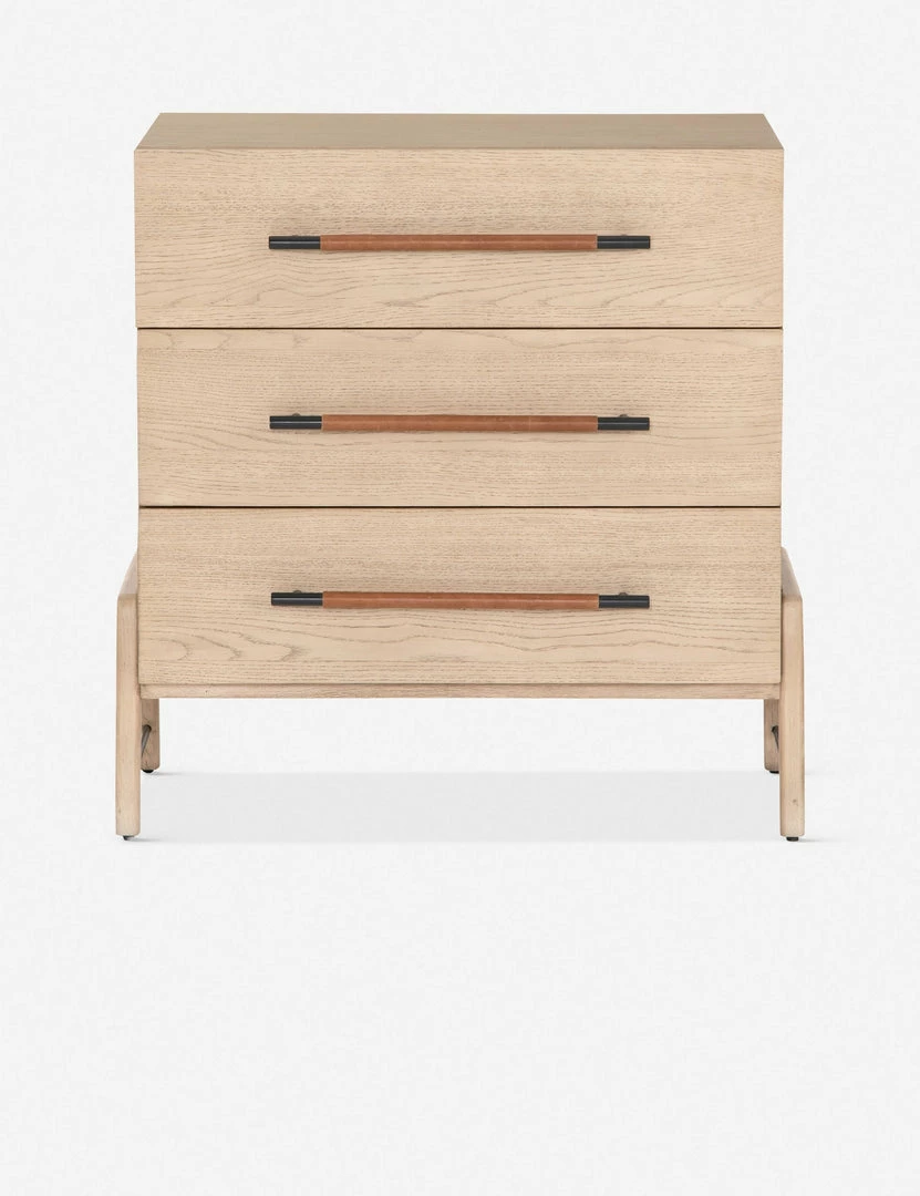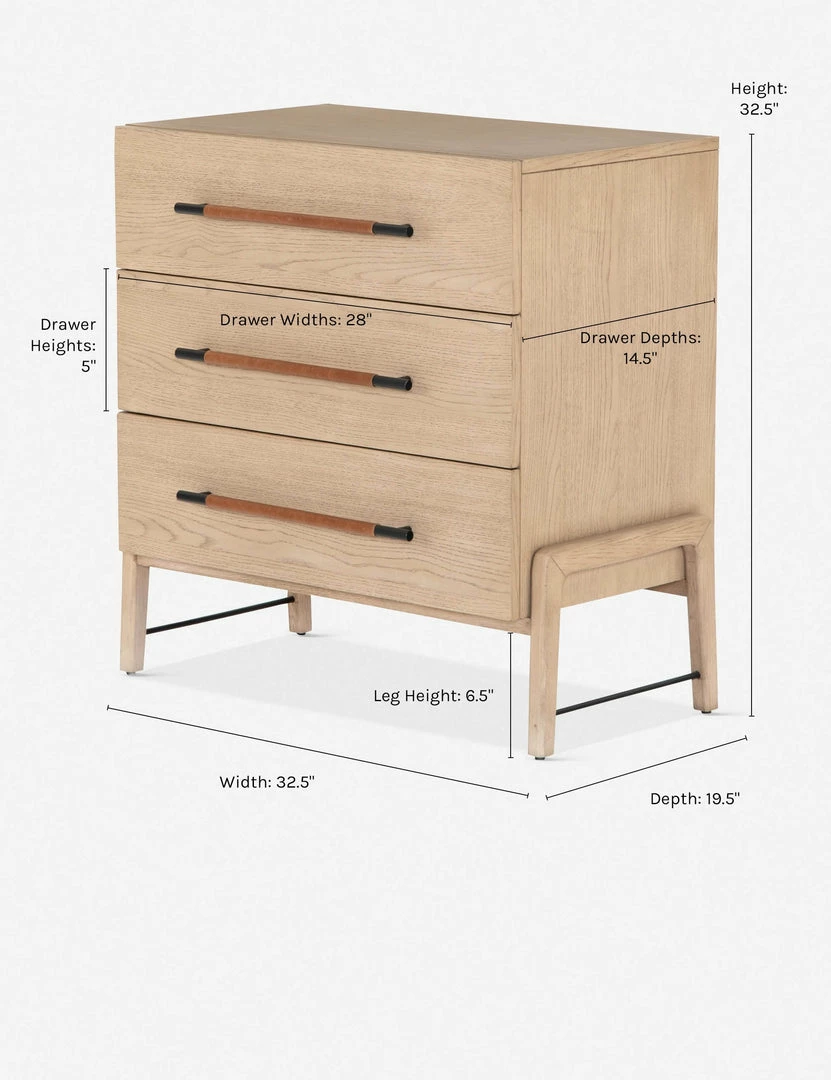 With its clean lines, sandy finish, and leather accents, this dresser brings a refined, minimalist effect to your bedroom. Constructed from solid oak and an oak veneer, it’s complemented by iron hardware and wrapped in tan top-grain leather. Three roomy drawers provide tons of storage space.