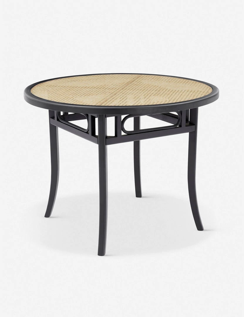 A versatile round table for transitional dining areas, combining traditional aesthetics and contemporary design elements: tapered legs, curved details, and a woven contrasting cane detailed top.