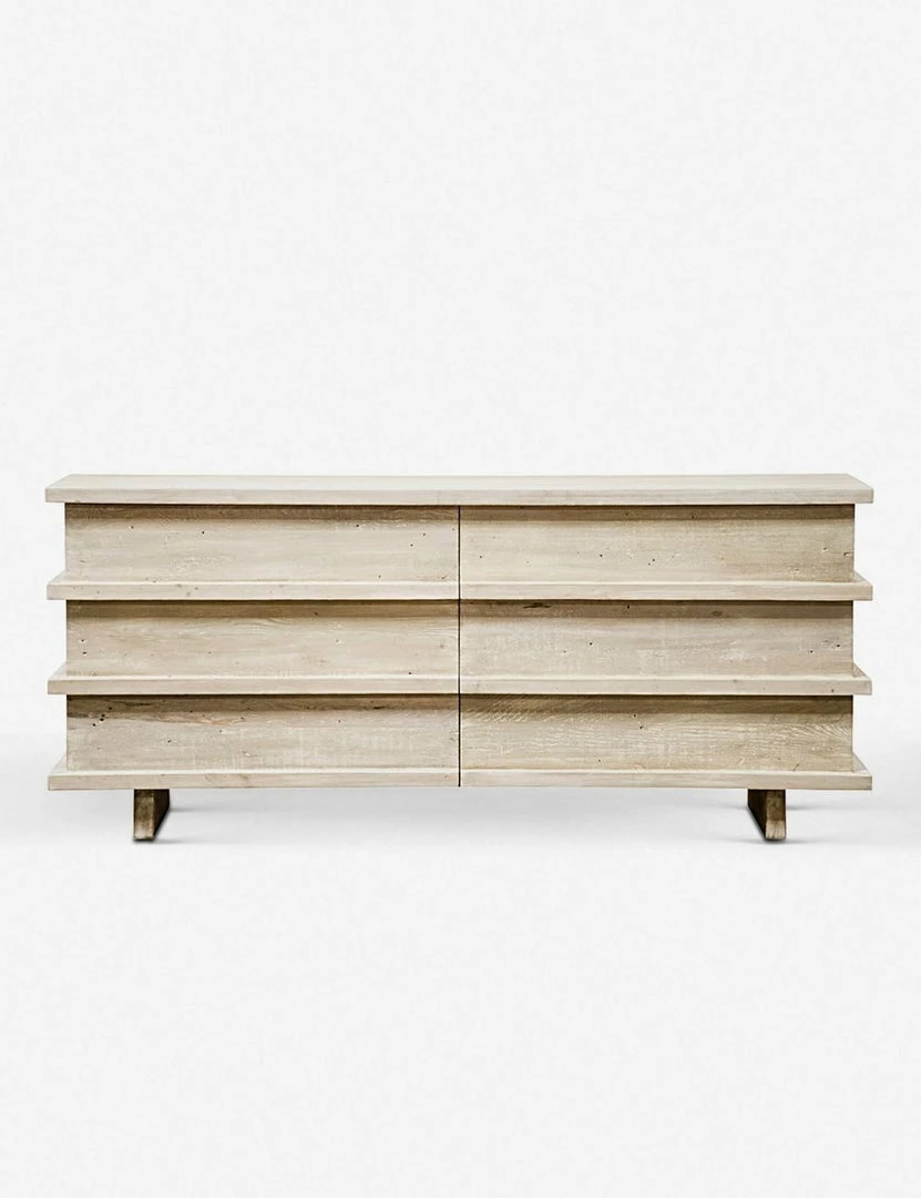 From the neutral gray finish on the reclaimed douglas fir wood, to the edgy modern silhouetteβwe love it all on this dresser. Six spacious drawers offer plenty of storage, and rectangular plank legs give the piece of bedroom furniture a streamlined, elevated feel. It’s the perfect place to prop your favorite oversized art print and a sculptural table lamp.