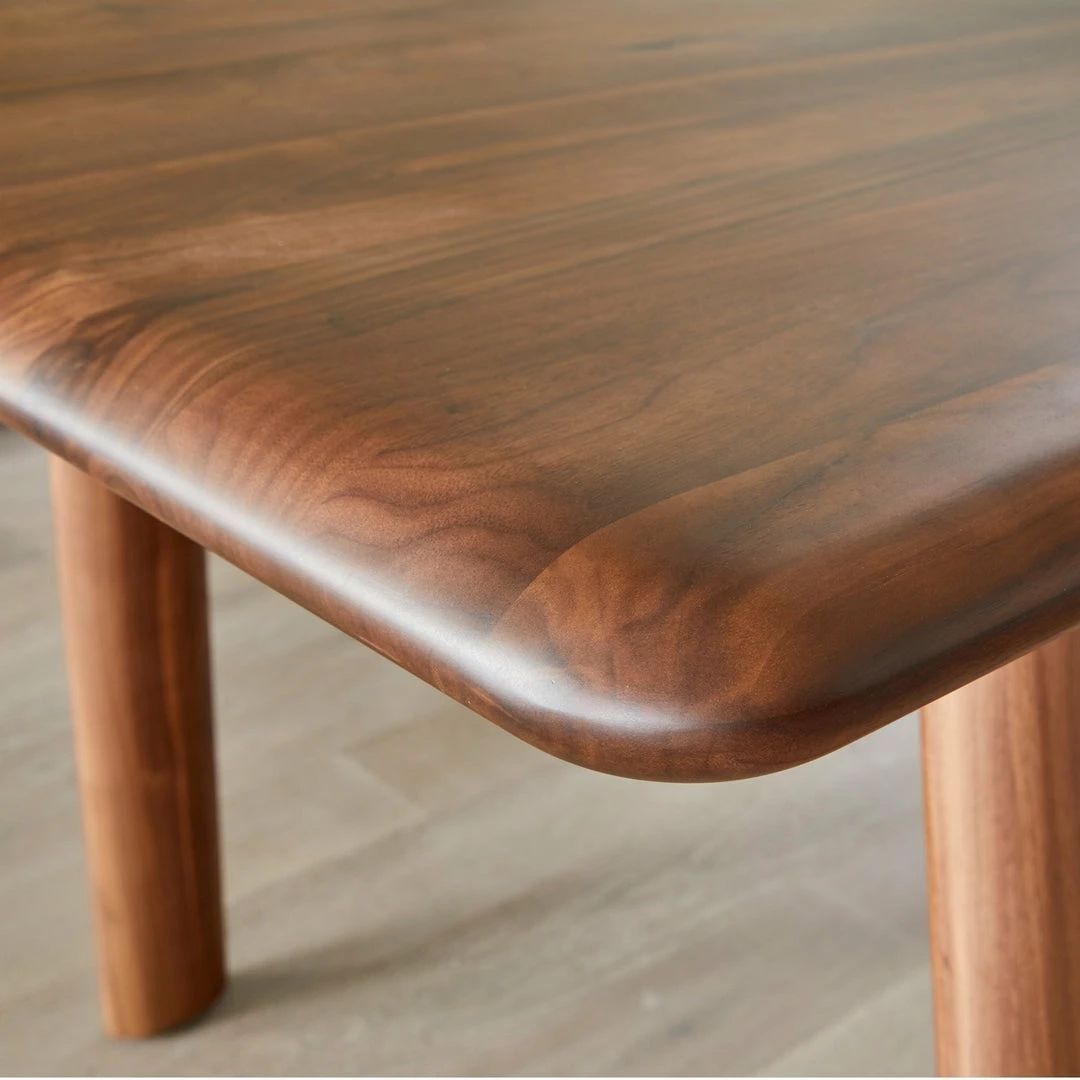 The rounded edges and thin bowed legs give the Edel table a Scandinavian feel while the warm walnut evokes mid-century inspiration. We’re styling this piece with low-profile chairs and a neutral palette to showcase its simple beauty.