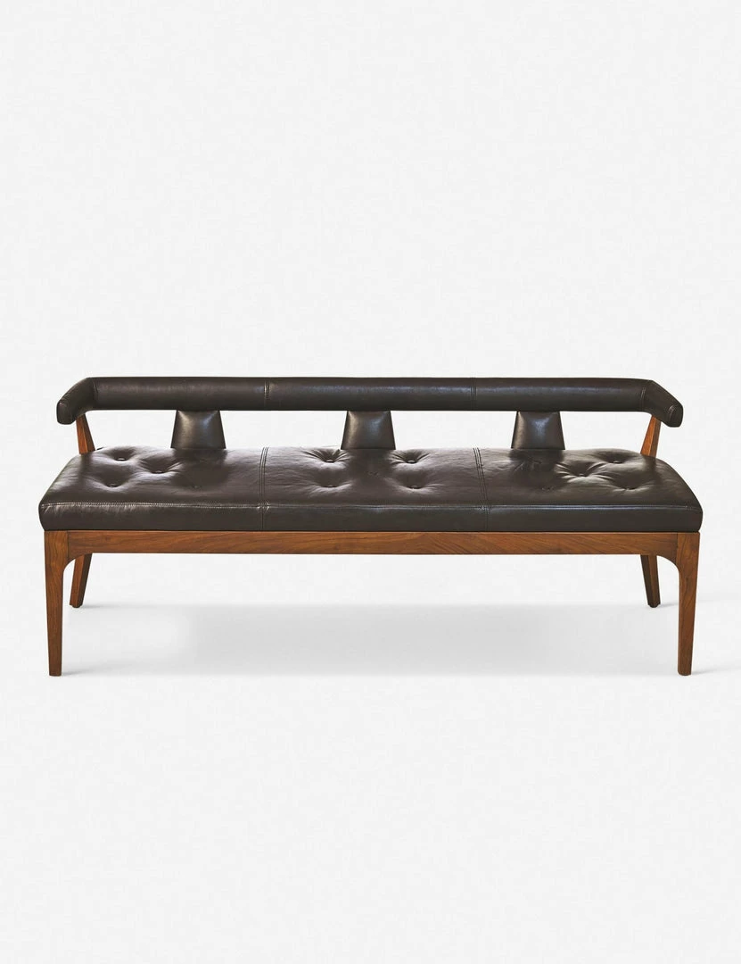 A more modern take on mid-century style. This bench contrasts a rich walnut wood frame with tufted leather cushioning for a classic look, then updates it with a low backrest with cutouts.