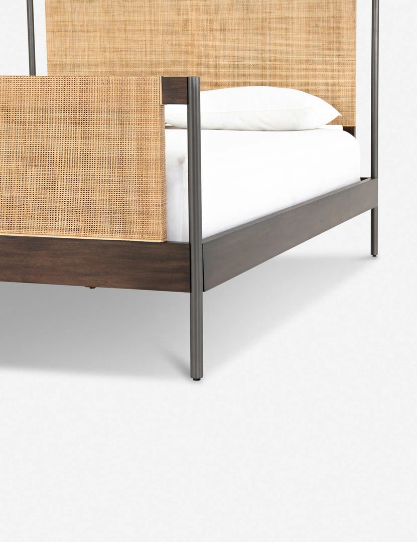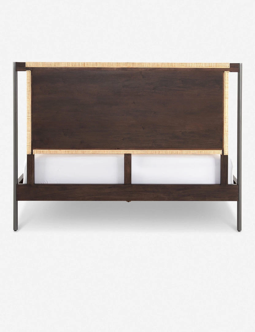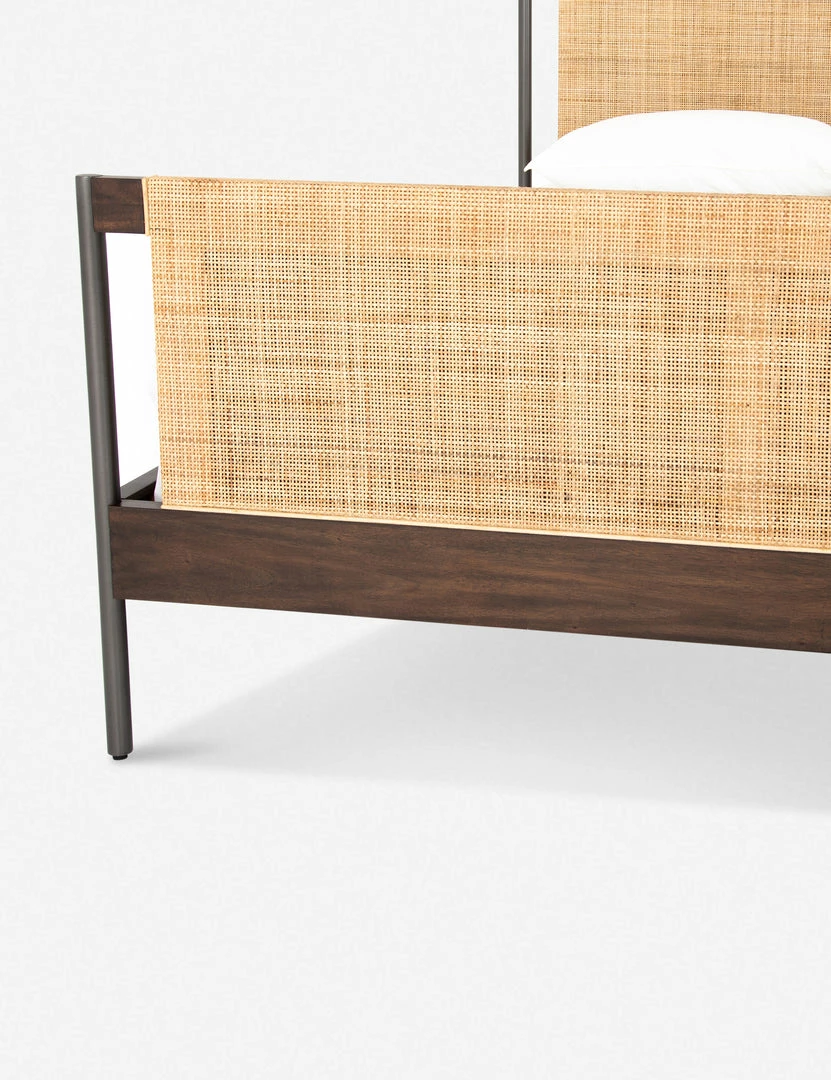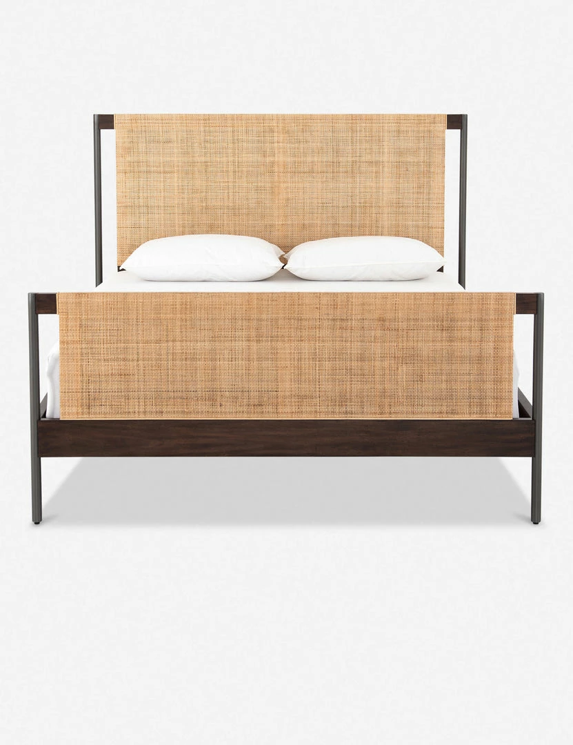 A floating design is clad in finely woven cane with mahogany backing to offer this bed an airy profile with natural textural appeal. The charcoal-finished iron base and wood stretchers ground this woven bed frame with headboard design with a touch of contrast for refined style in a fresh tone.