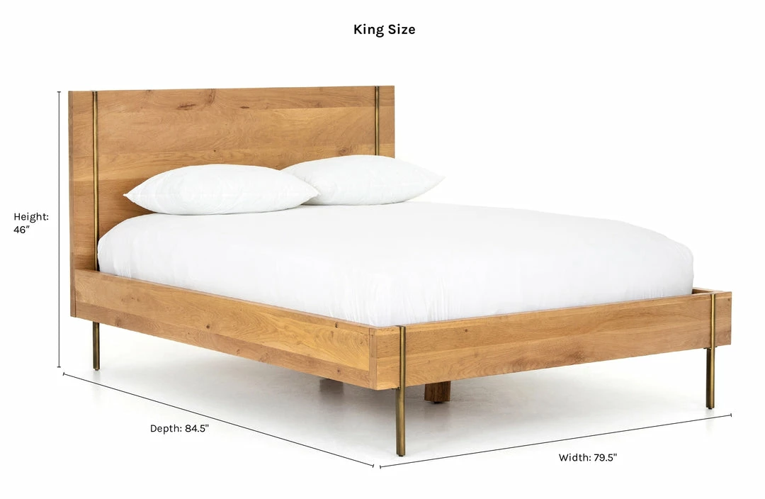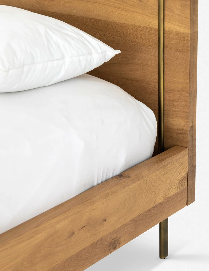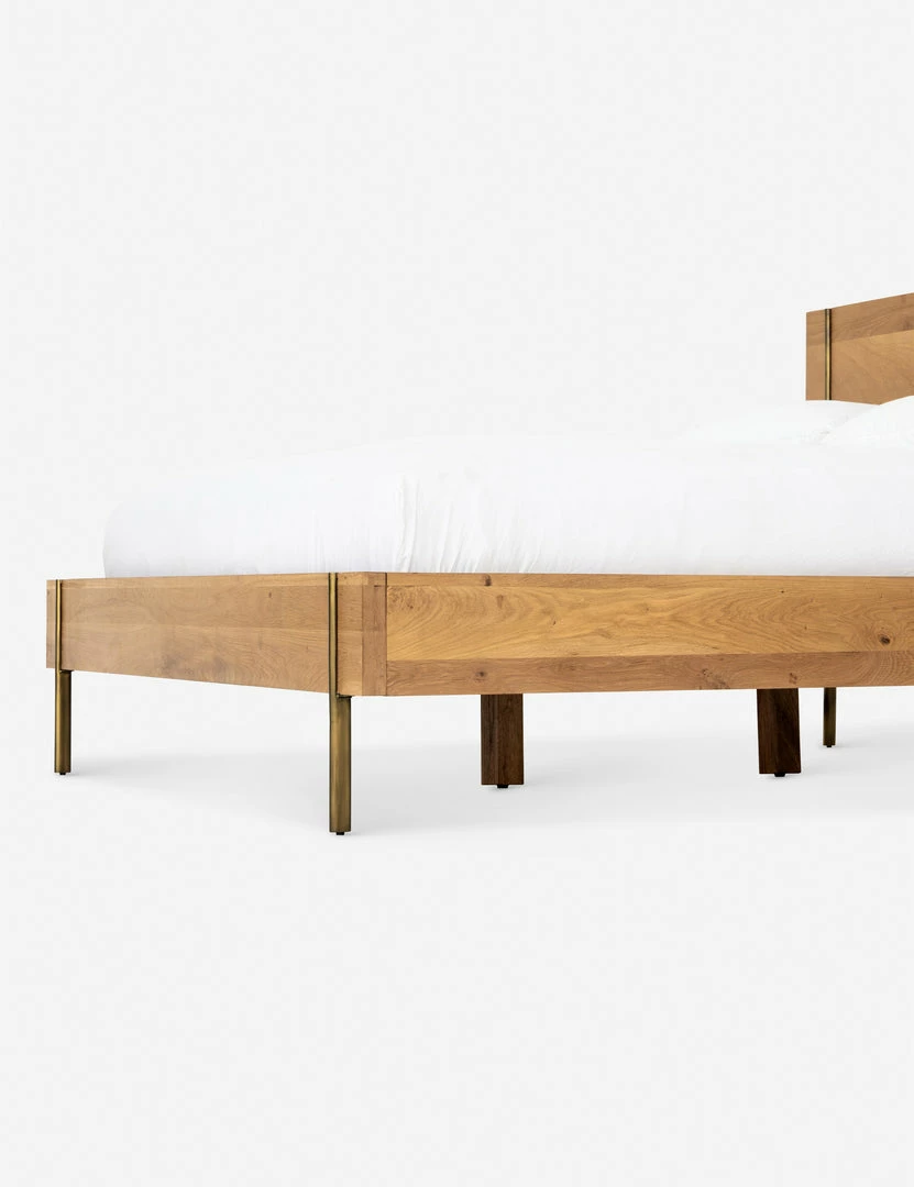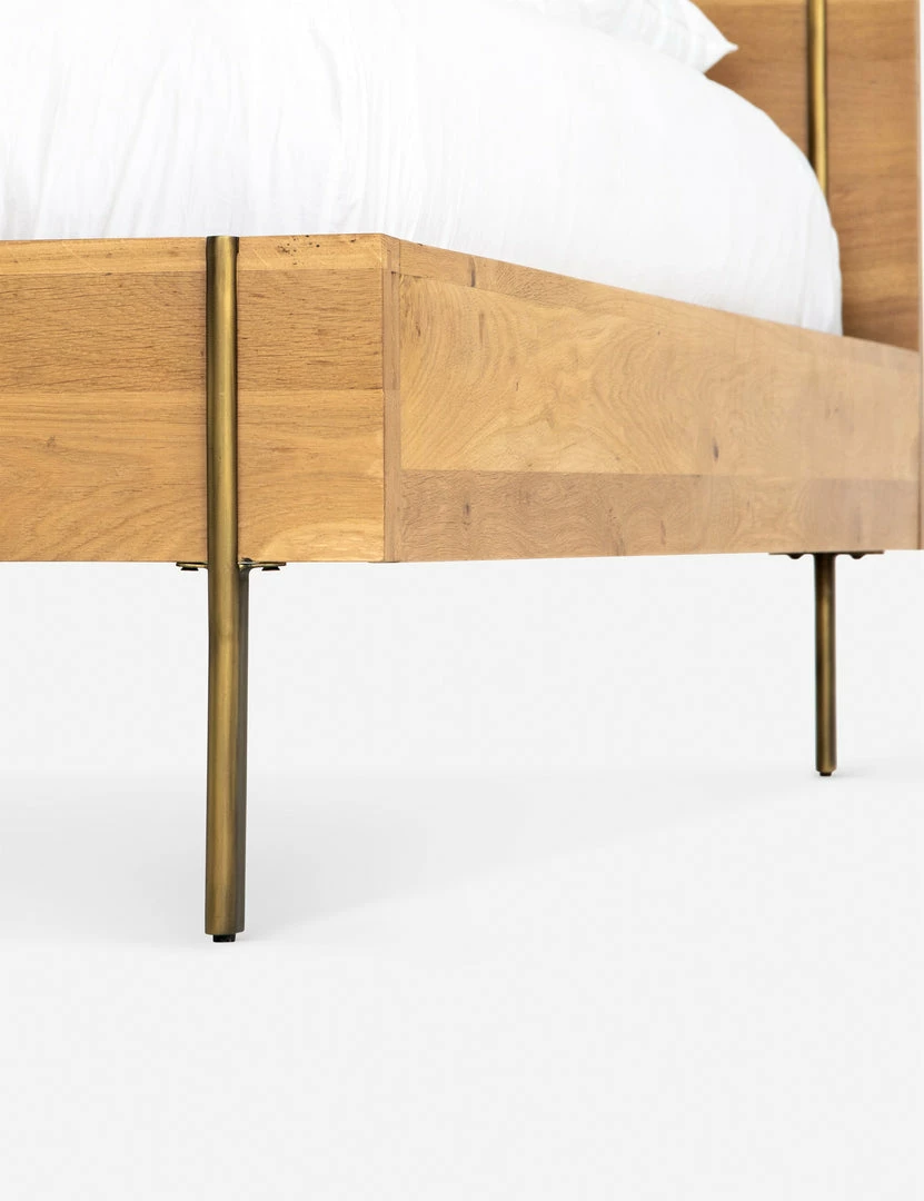 Combining streamlined design and retro details, the Karma collection is ideal for modern spaces. This bed frame features natural oak variations and thin brass legs.