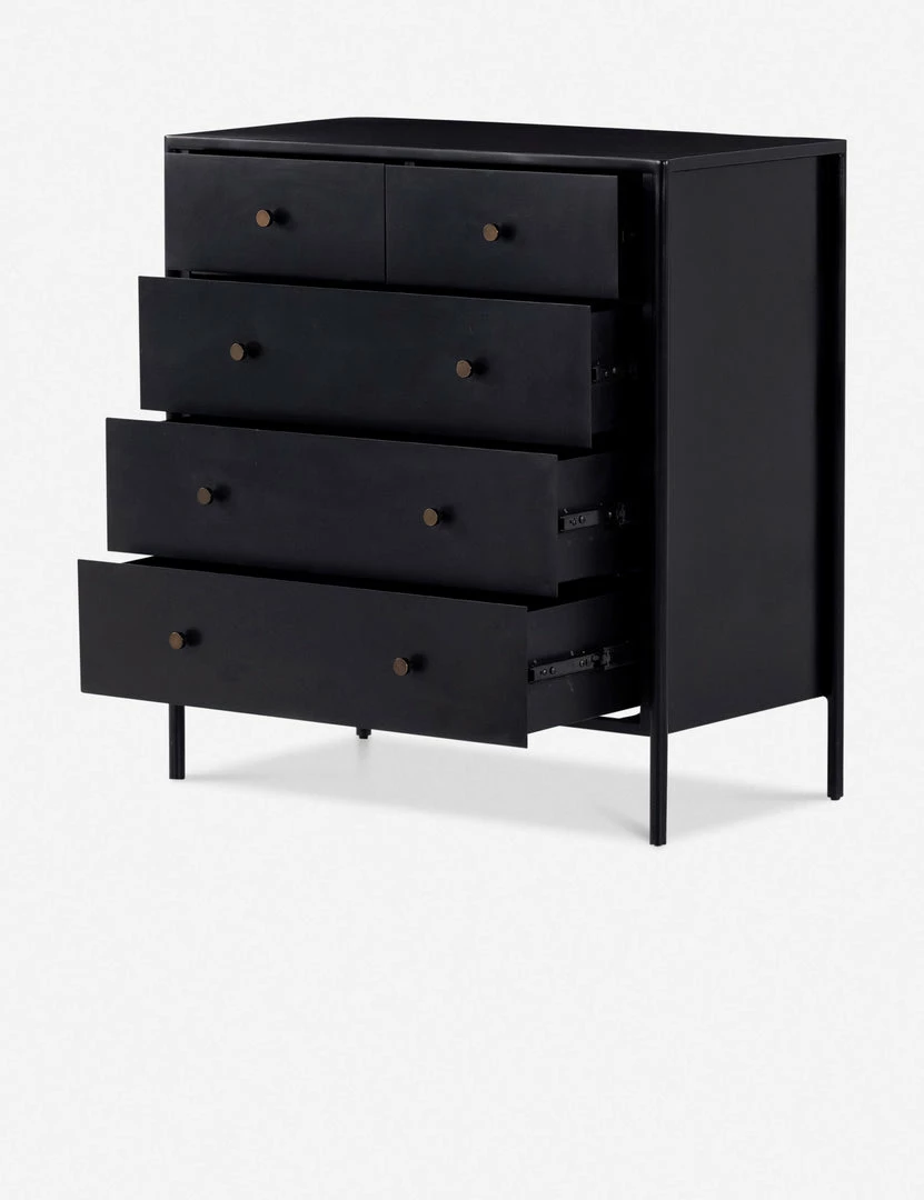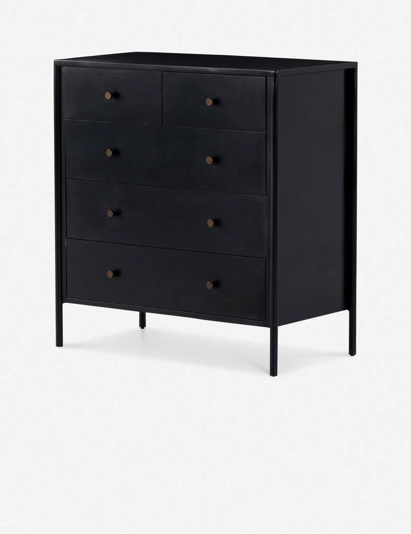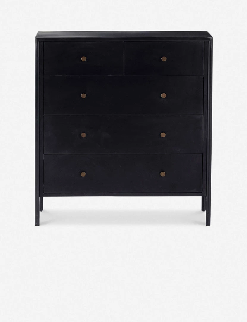Black-finished iron set in a refined profile and fitted with bronzed iron hardware to evoke a clean, polished industrial look with stunning visual impact. This sleek five-drawer dresser offers ample storage in a lofty, compact profile.