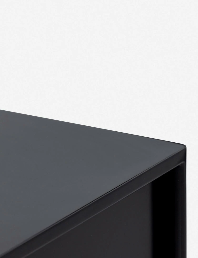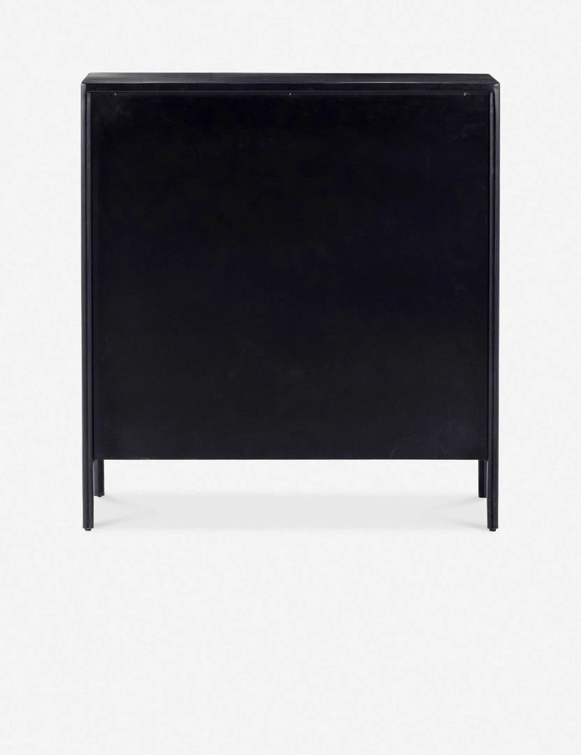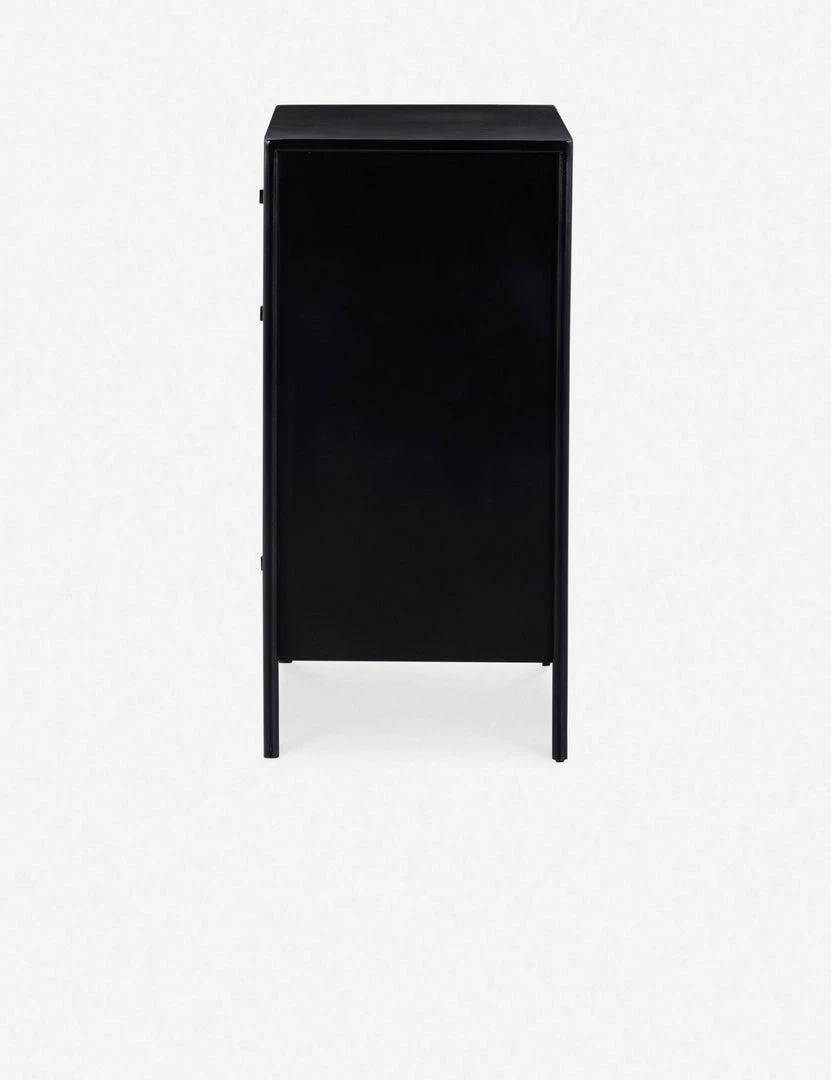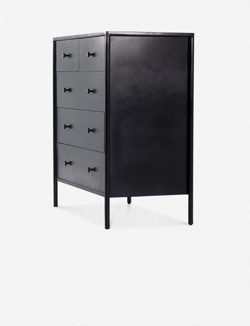 Black-finished iron set in a refined profile and fitted with bronzed iron hardware to evoke a clean, polished industrial look with stunning visual impact. This sleek five-drawer dresser offers ample storage in a lofty, compact profile.