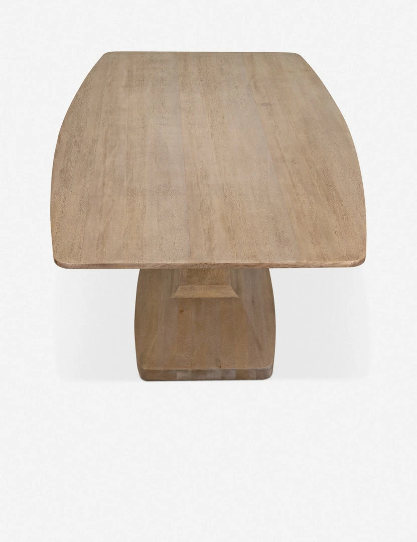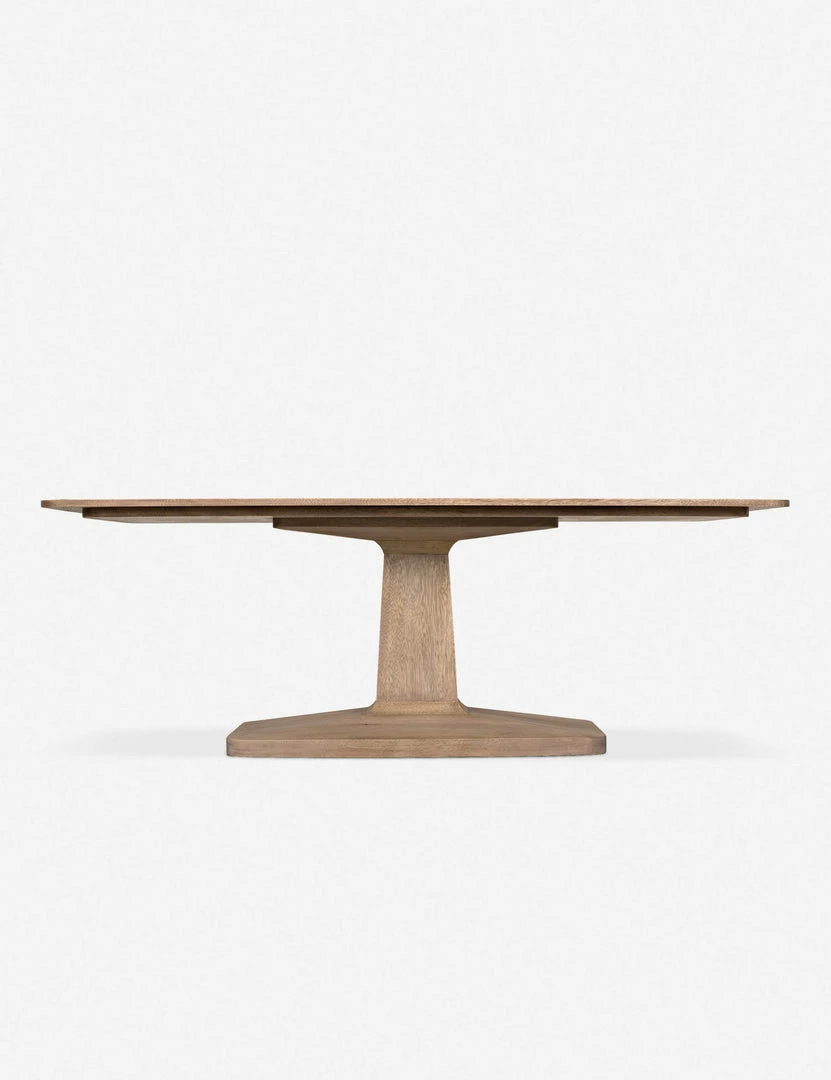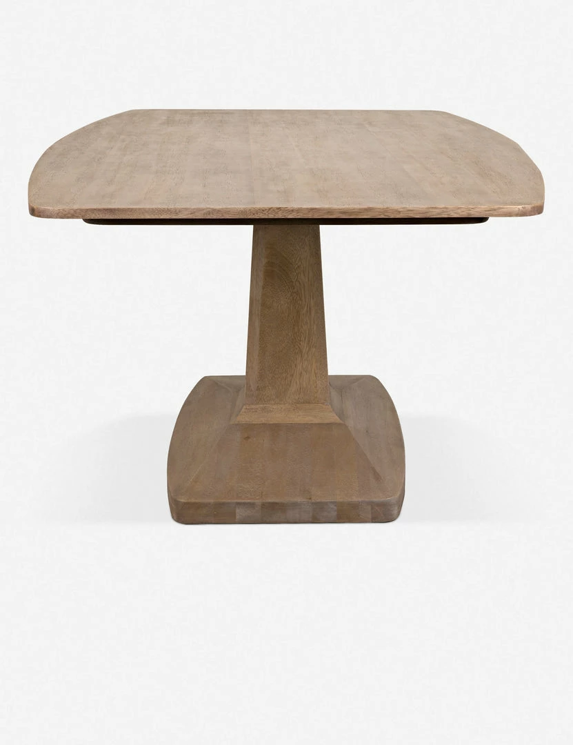 Your contemporary dining room deserves a table that lives up to your aesthetic. This rectangular table is the perfect pick, featuring tapered angles along the pedestal base, and rounded corners for a softer take. Finished in a washed walnut for a more lived-in appeal.