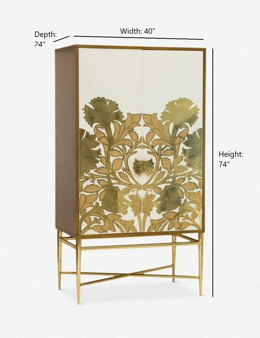 The Poppy Armoire is an editorial piece that brilliantly highlights renowned Arts & Crafts textile designer William Morris’s “Poppy” pattern that was originally designed in 1881 and known for its simple, monotone representation of poppy foliage. The interior houses removable shelves and a hanging bar for storage needs, while the exterior showcases various mixed materials such as a teak frame, brass base, and lacquered doors with brass and inlaid cane weave details for a statement making piece.