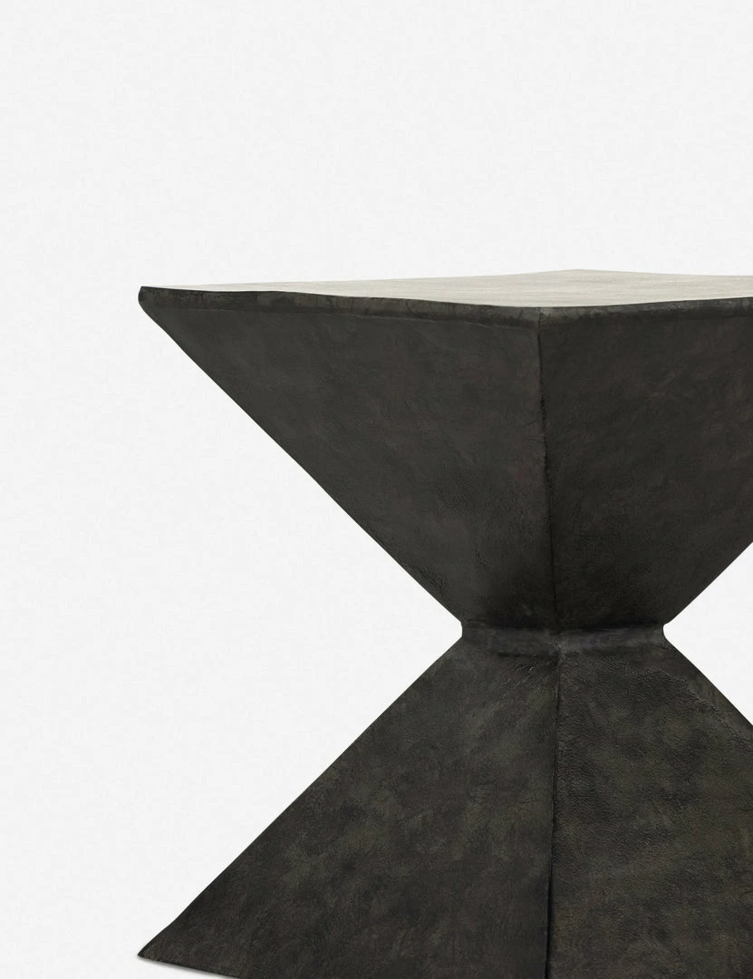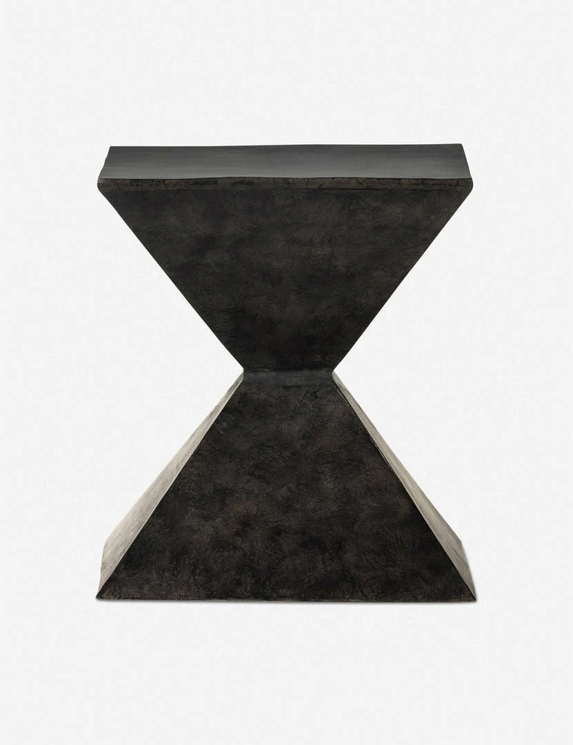 Moody tones abound in this sculptural side table. Two inverted pyramids join to create an hourglass-like silhouette set off by the coarse texture of the black-finished aluminum. Pair an accent chair or sofa with this end table for a raw industrial layer with visual impact.