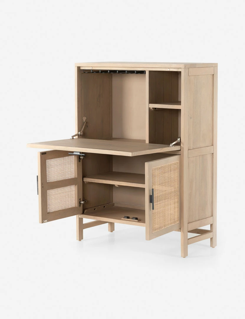 This bar cabinet is crafted with solid mango wood and woven cane paneling then finished with sleek iron hardware for layers of natural texture. A spacious interior features storage for stemware while a drop-down front makes the perfect surface for glassware and spirits. We love its organic warm tones for a transitional space.
