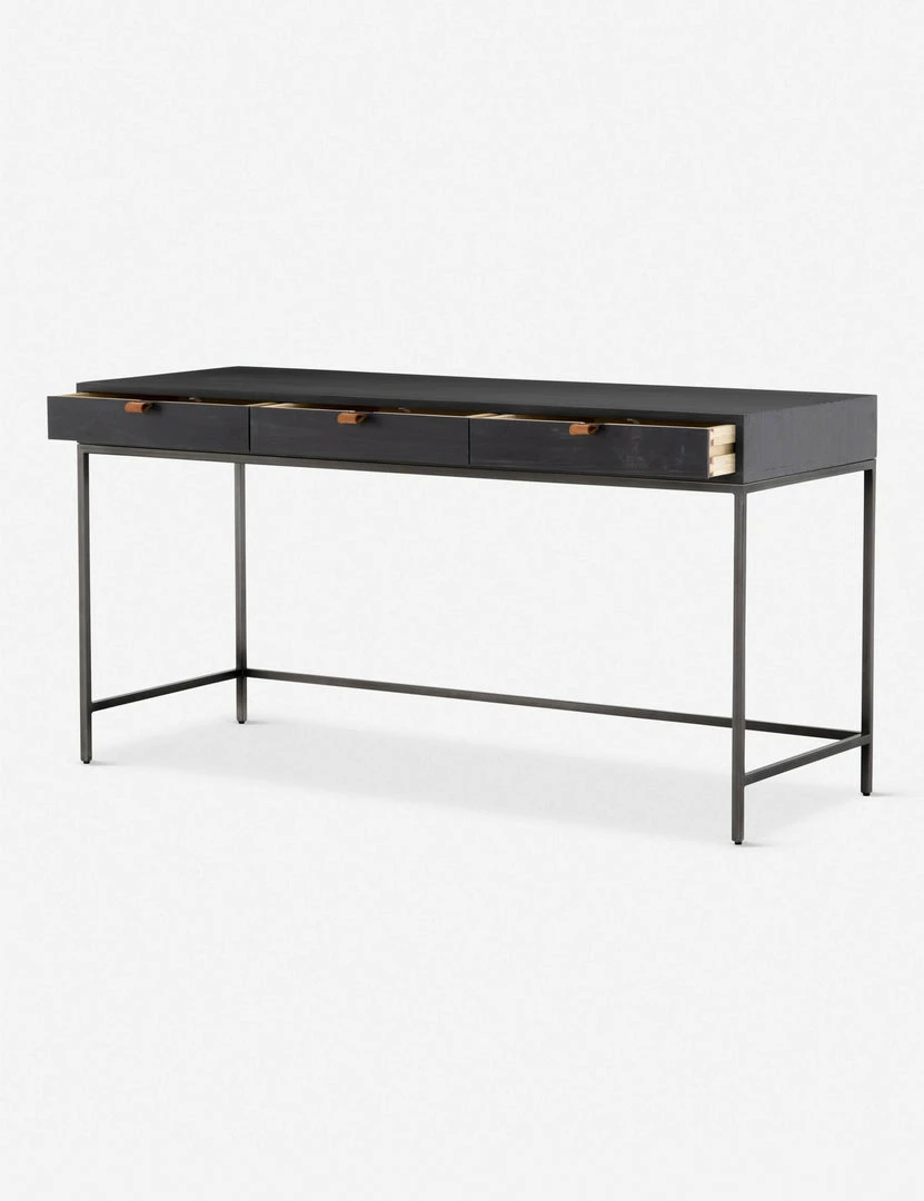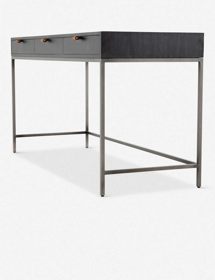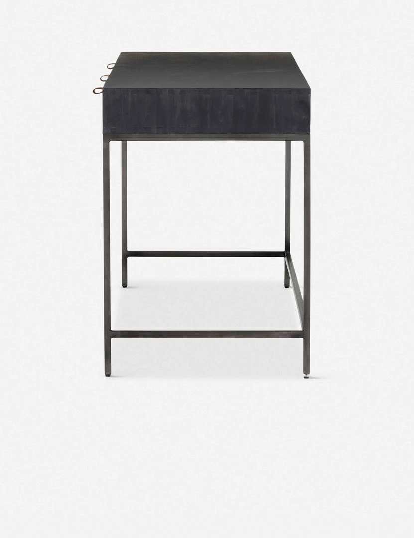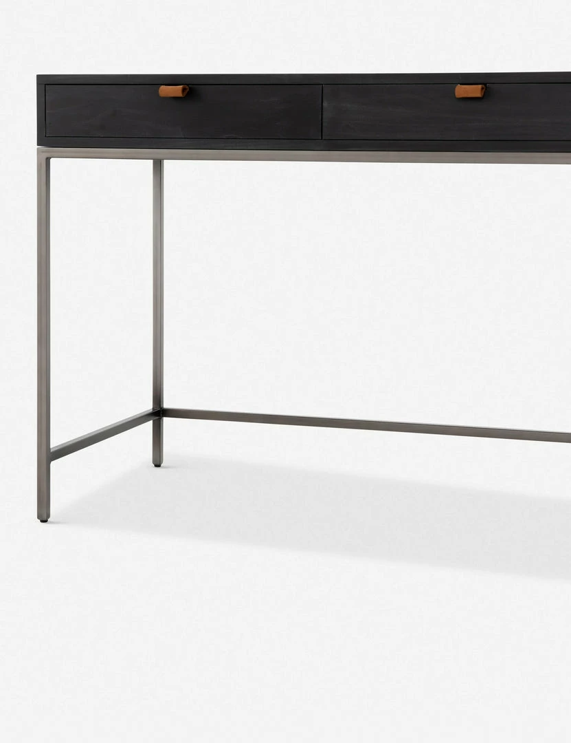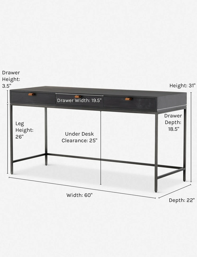 Keep your office style grounded (and super organized) with this wooden desk. Features elements of mid-century aesthetics like a black wash, slim iron base, and top-grain leather drawer pulls.