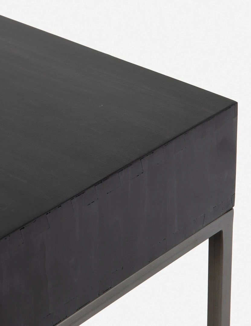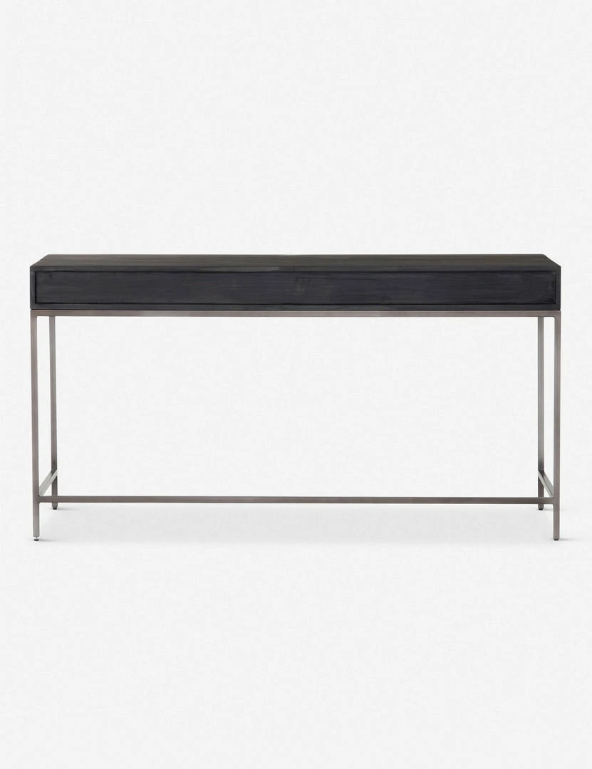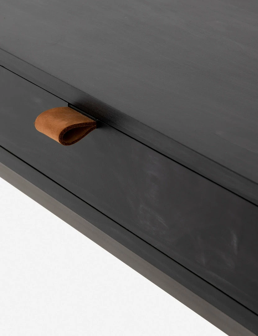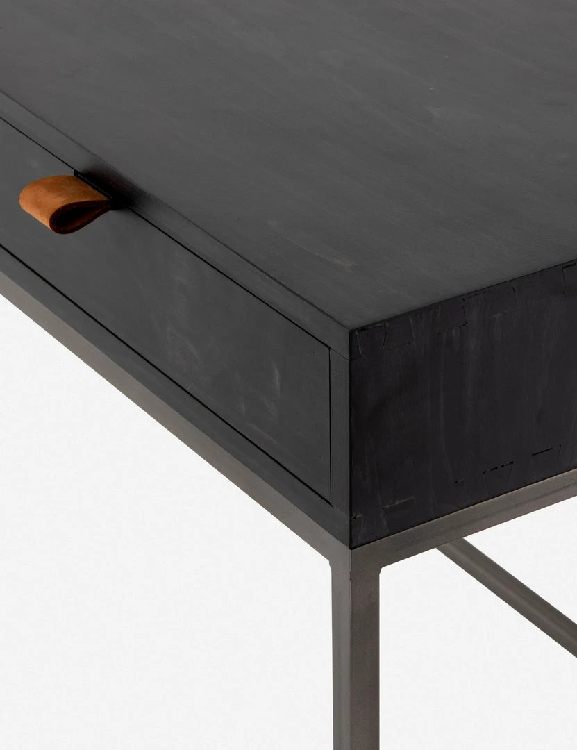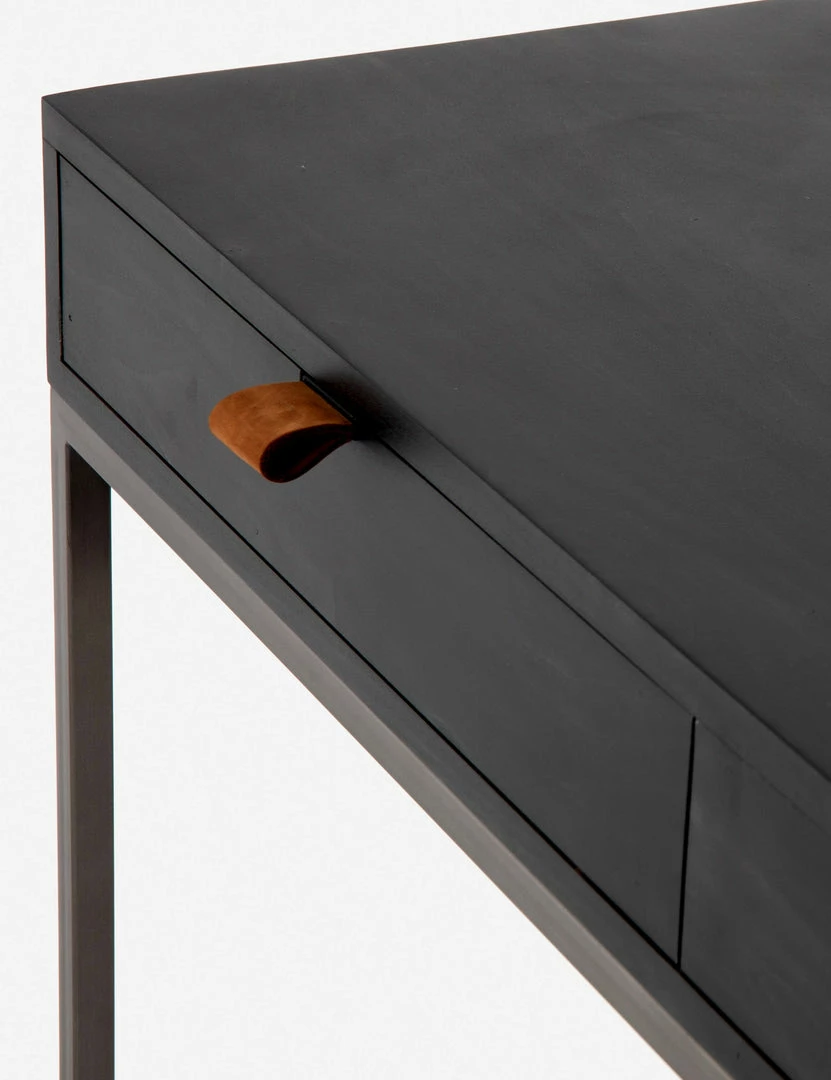 Keep your office style grounded (and super organized) with this wooden desk. Features elements of mid-century aesthetics like a black wash, slim iron base, and top-grain leather drawer pulls.