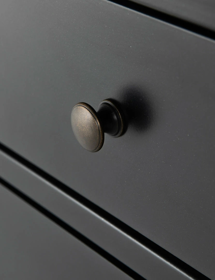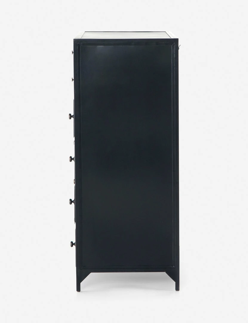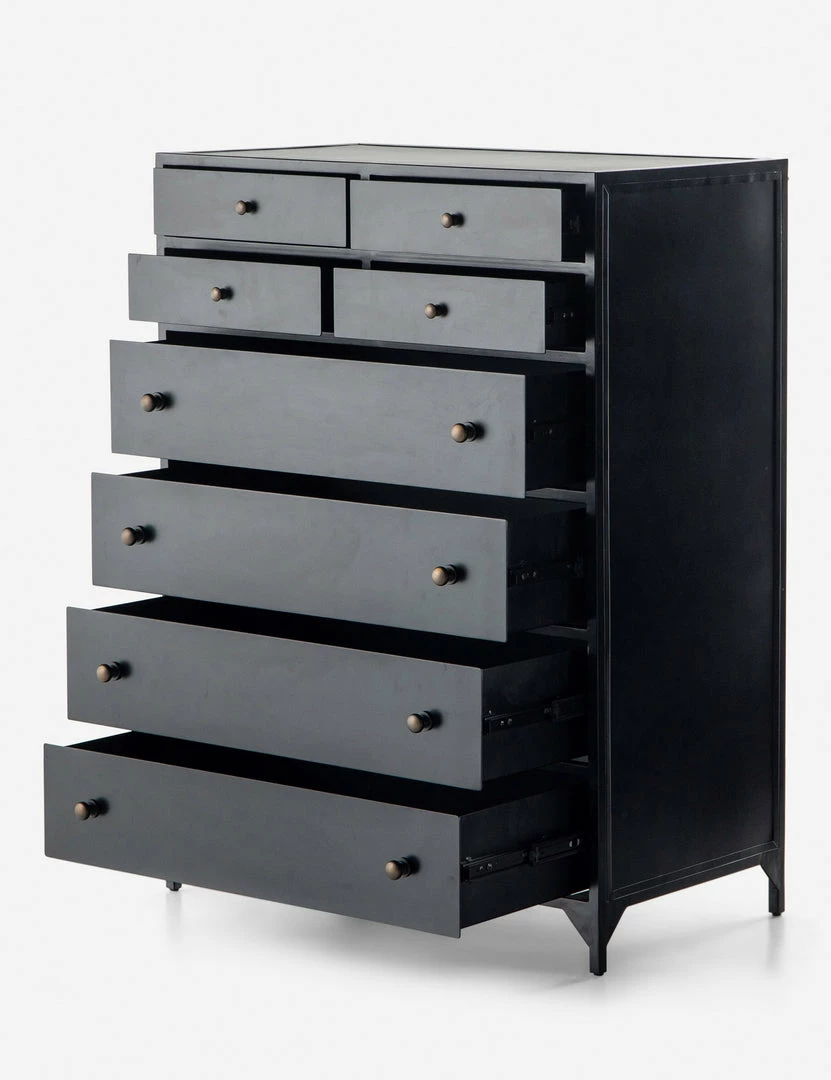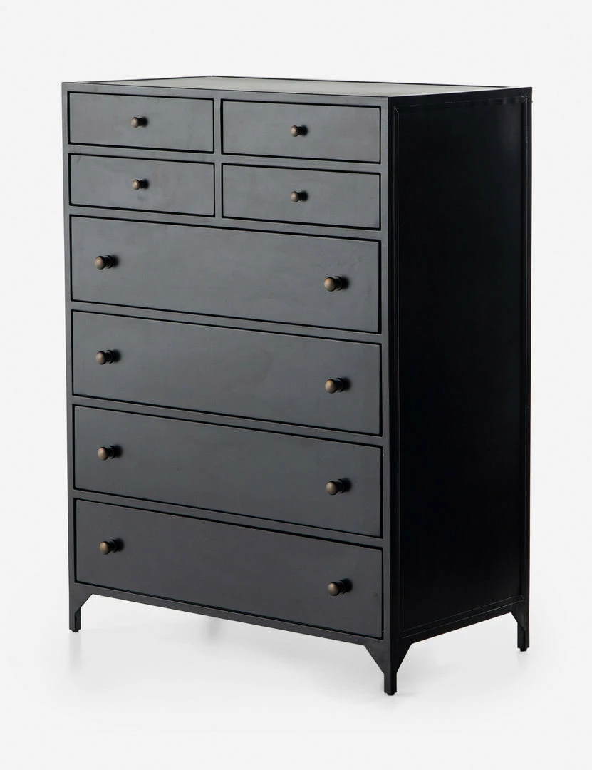 Perfect for industrial-inspired bedrooms, this tall eight-drawer dresser brings a sophisticated touch thanks to round brass drawer pulls that add a little shine to the black iron framing.
