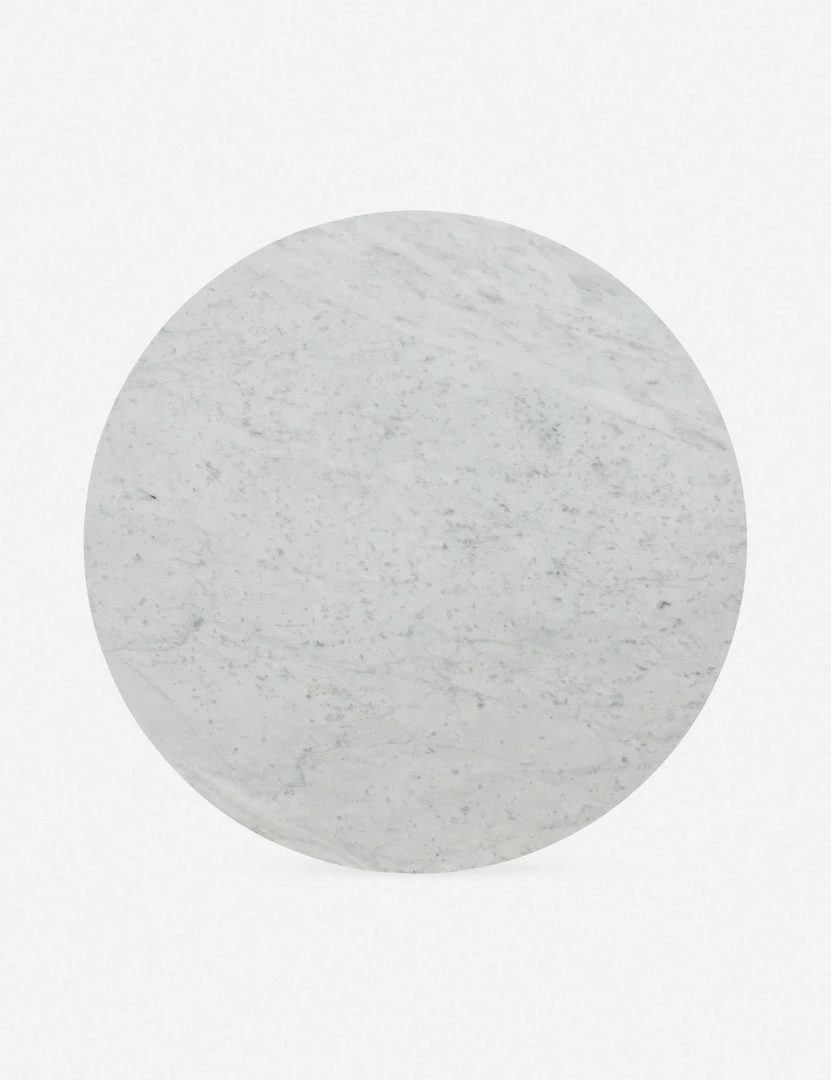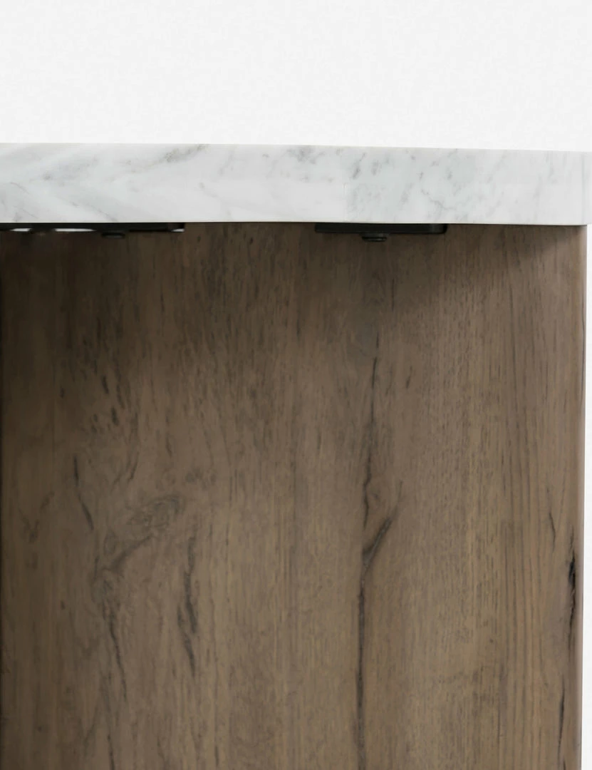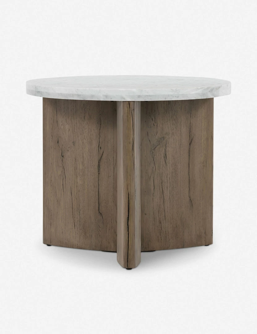 Mixed materials create a polished contrast in this luxe side table design. Thick-cut oak forms a sculptural base topped by a round white Italian marble tabletop with beautifully subtle striations. Finish your look with this end table for elevated everyday decor.