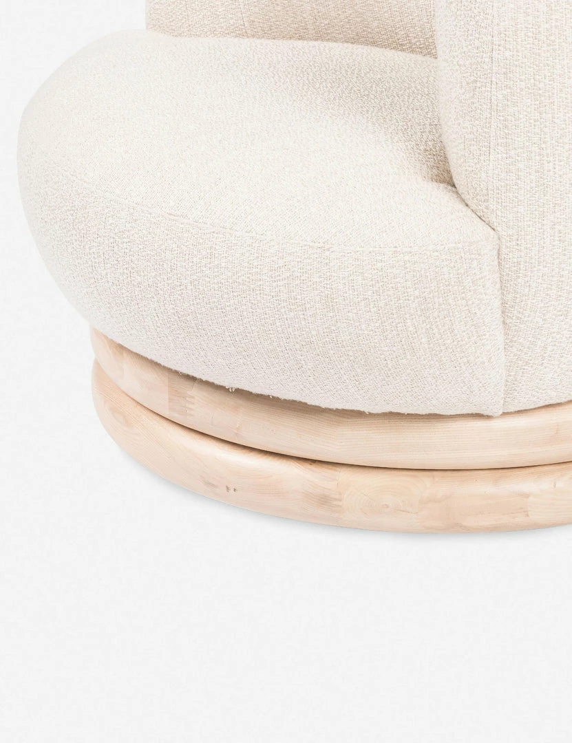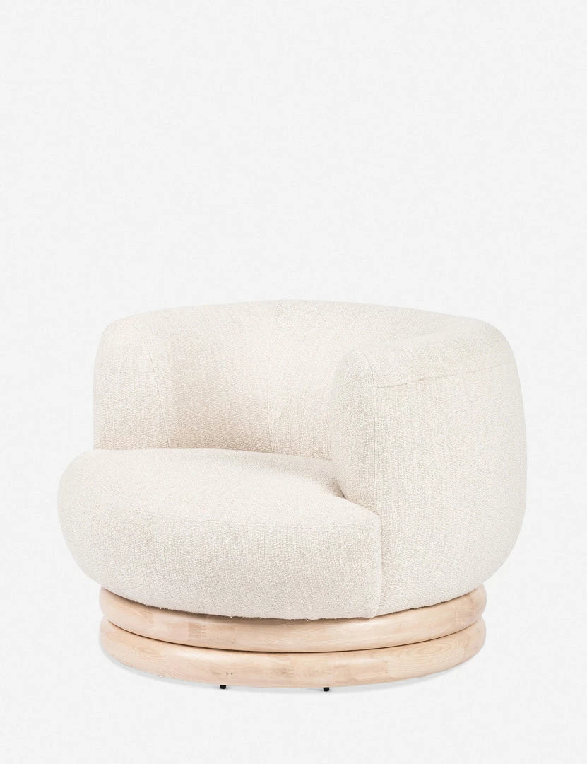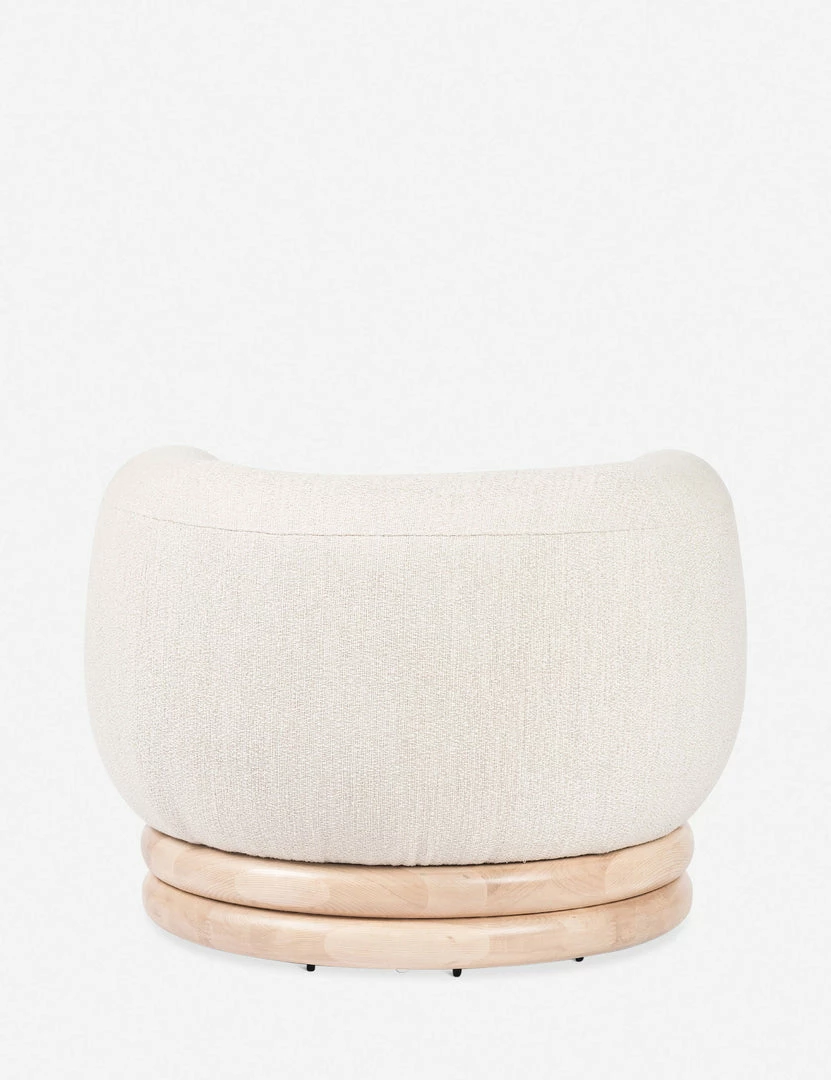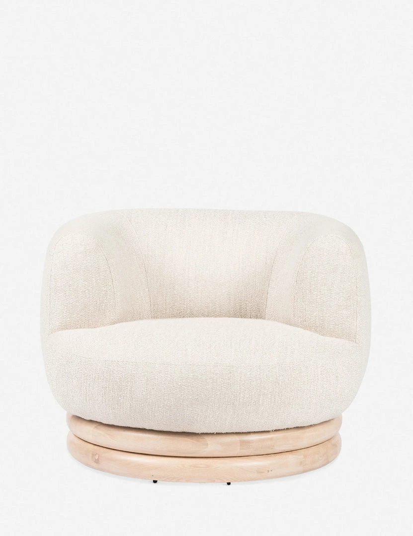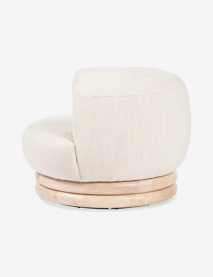 This flowing chair design pairs sculptural curves with soft performance upholstery to elevate your everyday lounge. The stacked swivel base is fashioned from solid ash wood to ground this accent chair with a subtle organic touch.