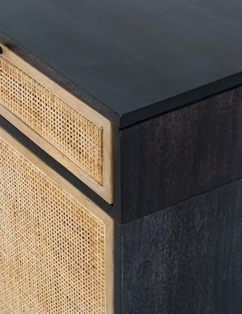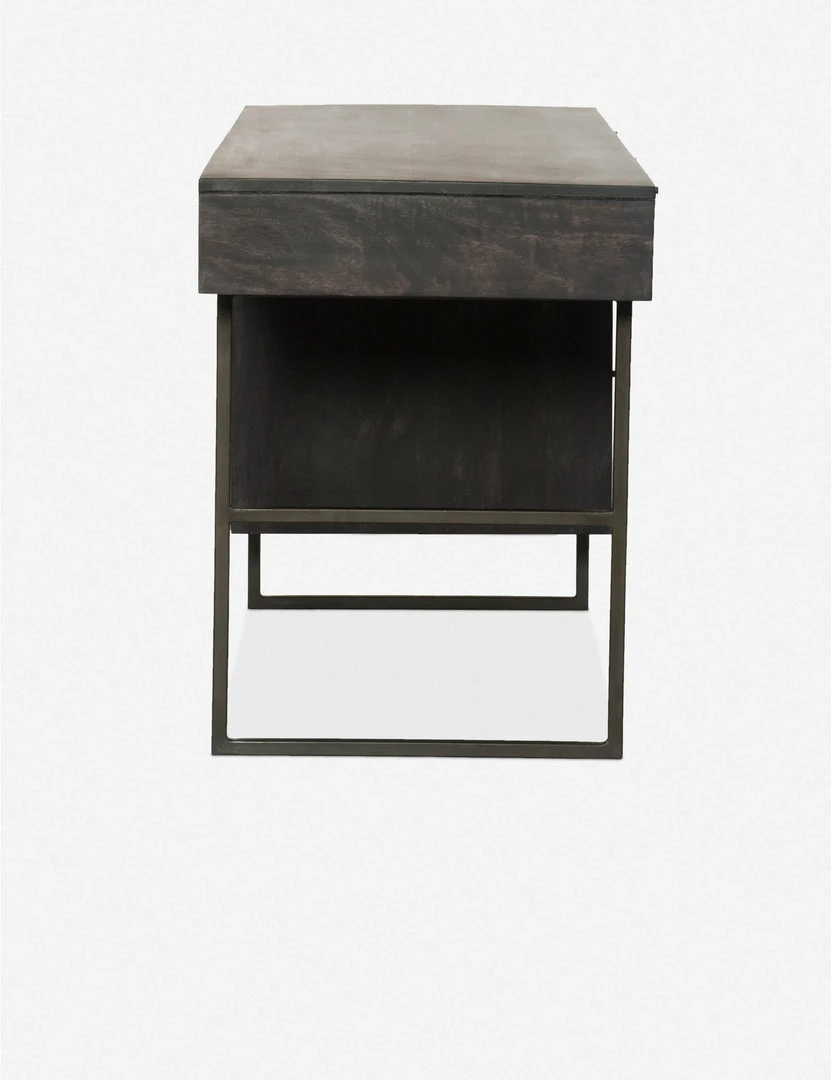A stylish option for your home office, this wood desk features natural-tone woven drawer fronts for added texture. Black metal legs and peg drawer pulls finish the look for a modern touch