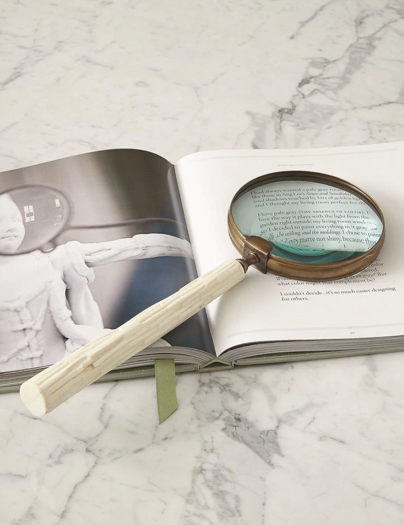 Inspire your desktop or coffee table decor with the old-world charm of this magnifying glass. Its handle is made from hand-chiseled bone to temper the polish of the brass and glass with a beautiful natural texture. We love this element as a playful yet functional addition alongside a collection of art books.