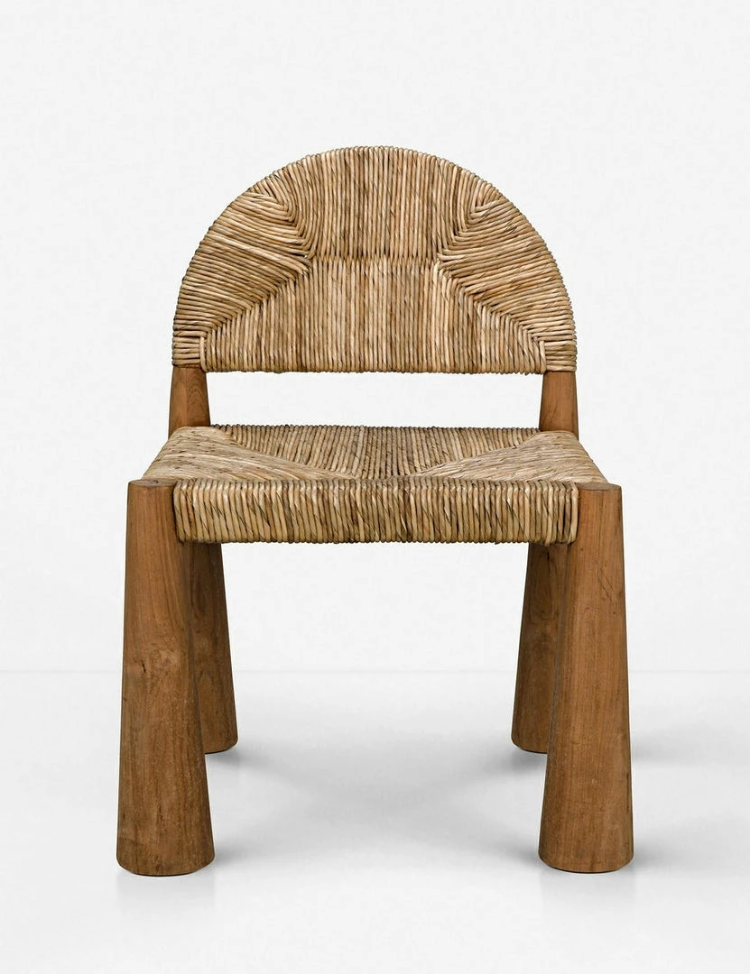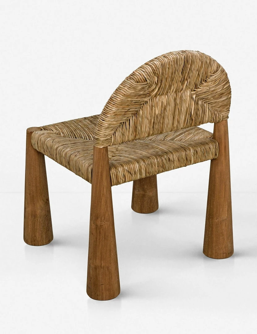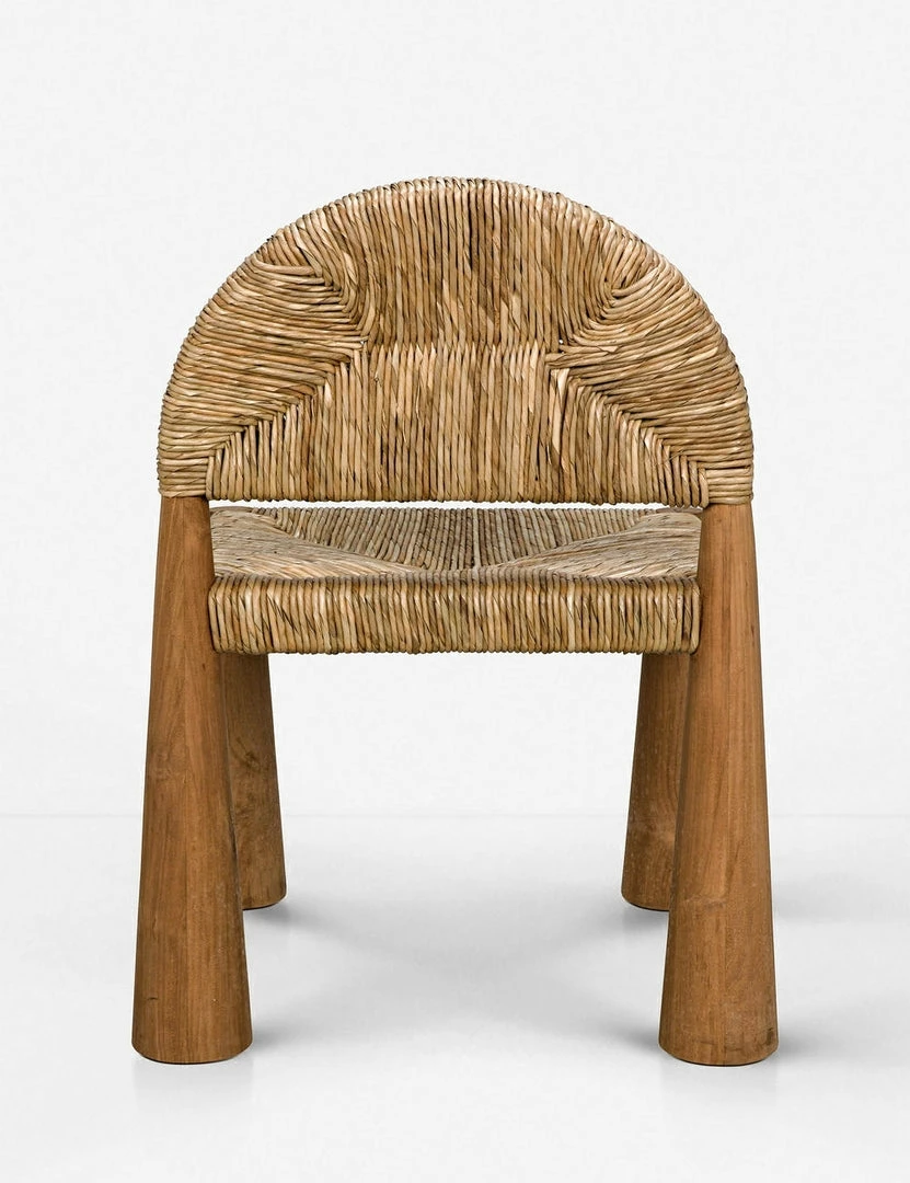 Exaggerated and sculptural, this chair is an instant statement piece. The half-moon back and square seat are crafted from woven sea grass and paired with conical teak legs. Style several around your dining table for a dramatic look or use as an accent chair in a vignette.