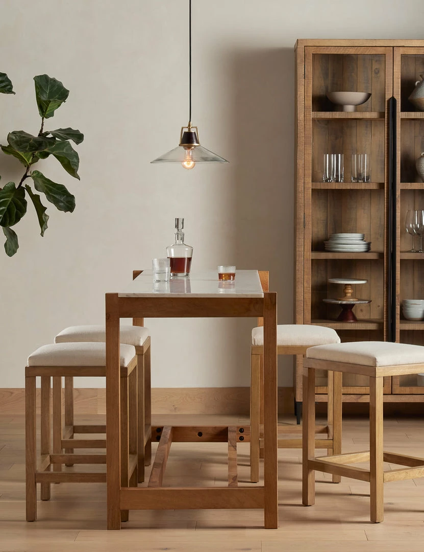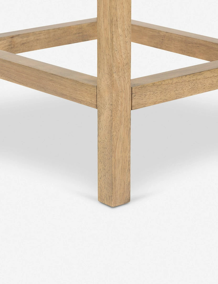 The burnished wood frame grounds this bar stool with rustic notes, while performance upholstery adds a soft touch. Shop this bar stool.