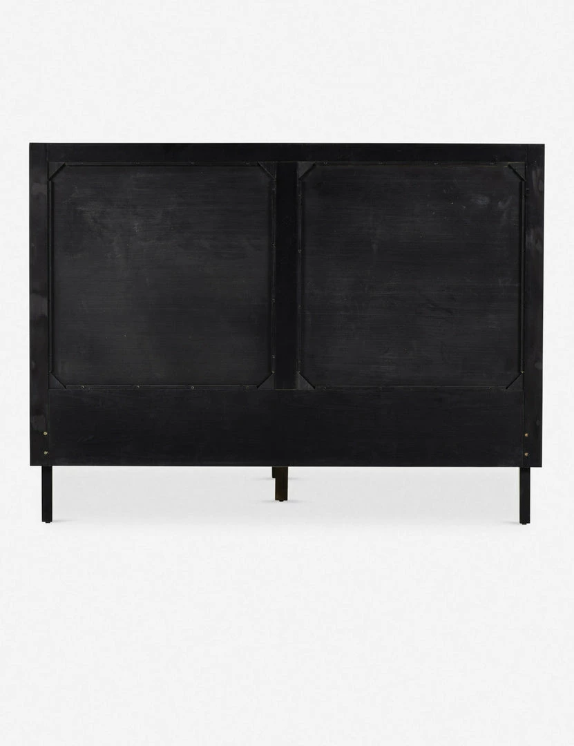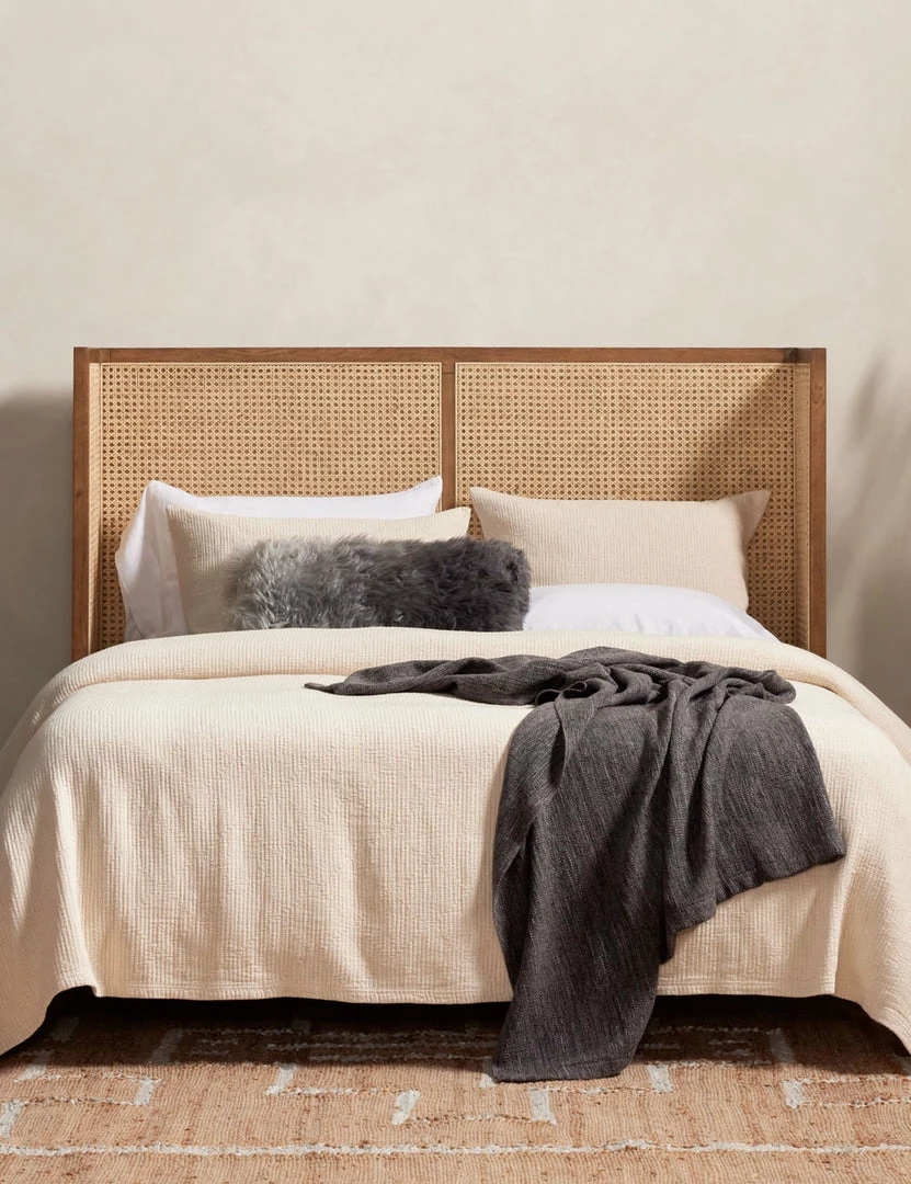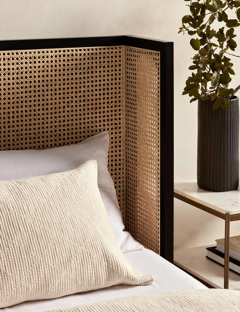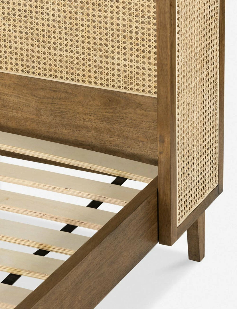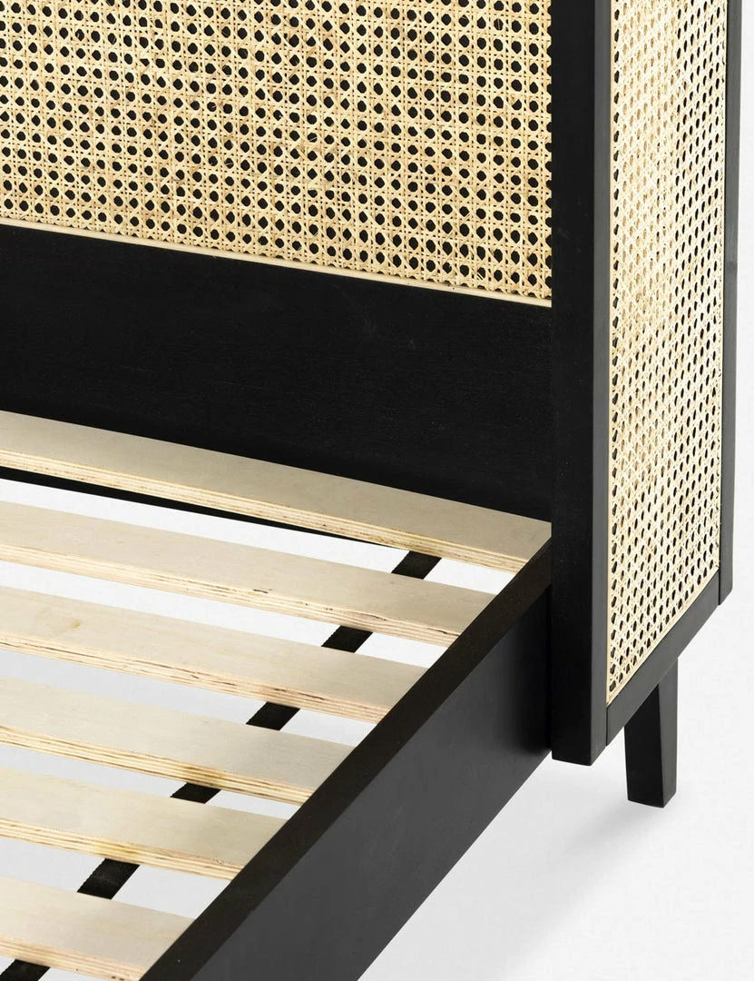 The Jeni Bed is lends tons of transitional appeal to your space. The clean-lined wingback design inspires an airy, timeless bedroom feel with its beautiful wood bed frame and cane paneled headboard.