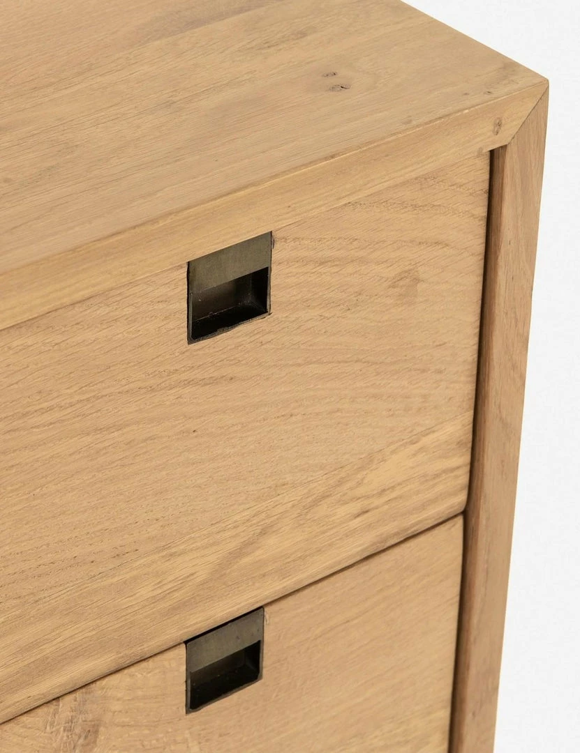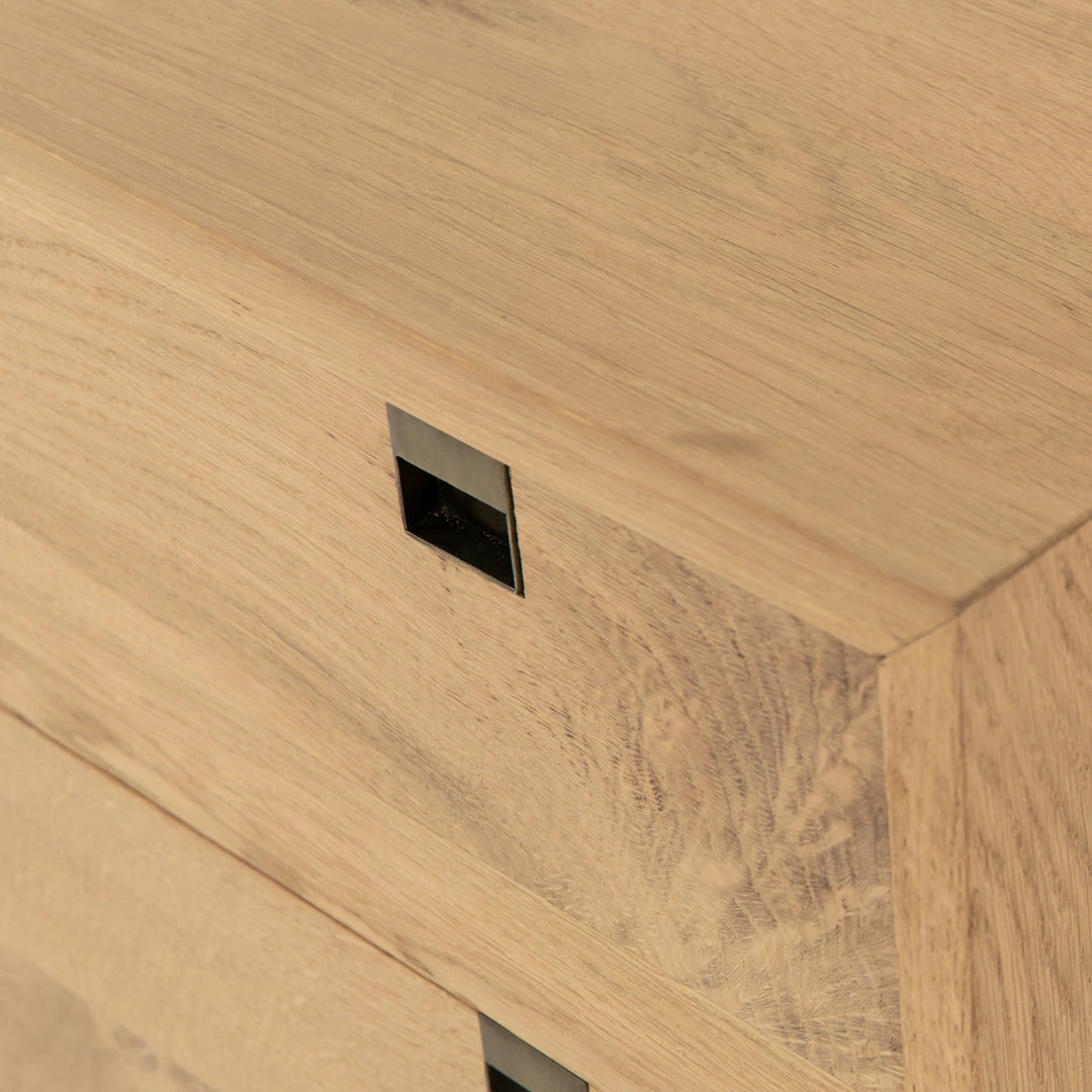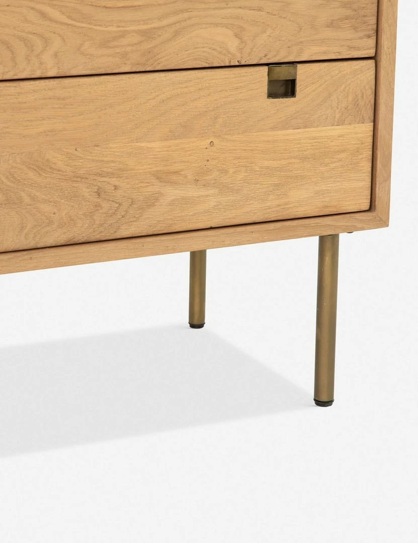 Combining streamlined design and retro details, the Karma collection is ideal for modern spaces. This dresser features cutout details, natural oak variations and thin brass legs.