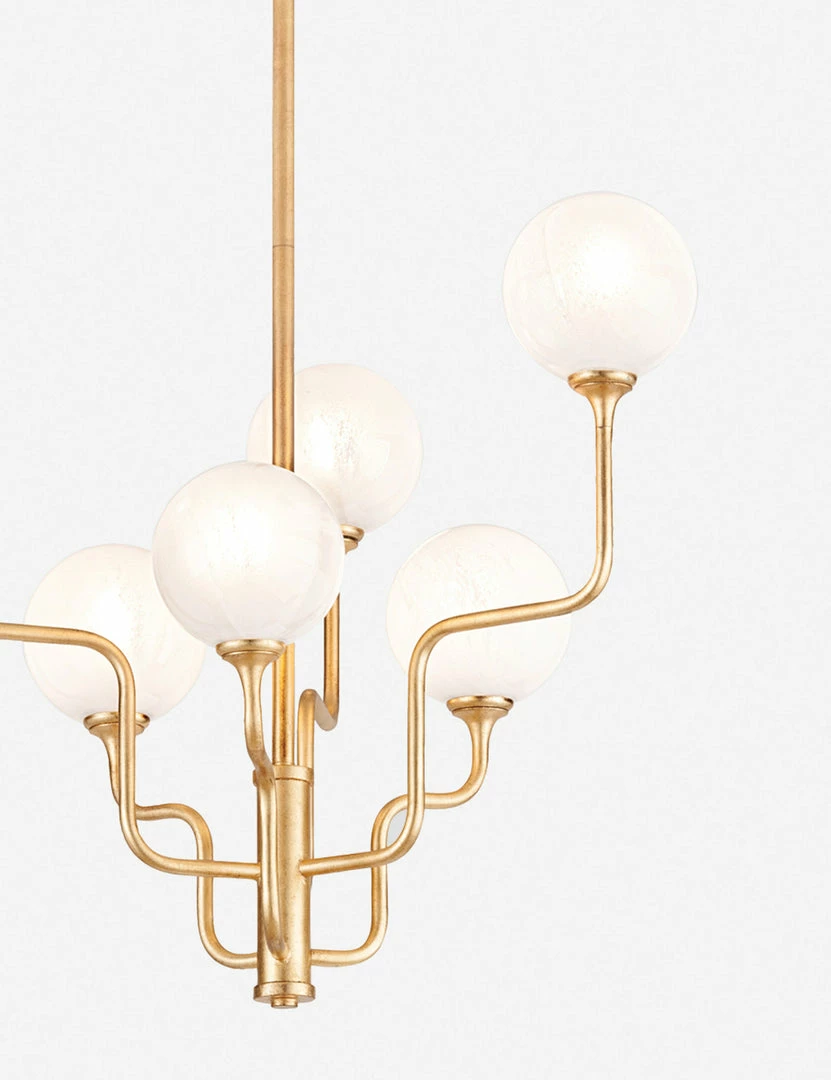 A frosted orb and gold leaf finish offer a touch of brilliance to the graceful lines of this chandelier. Create an opulent overhead statement in a living or dining room with this show-stopping chandelier design.