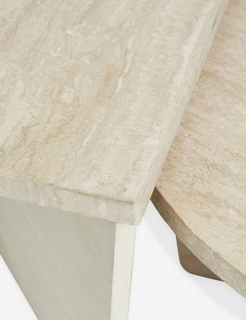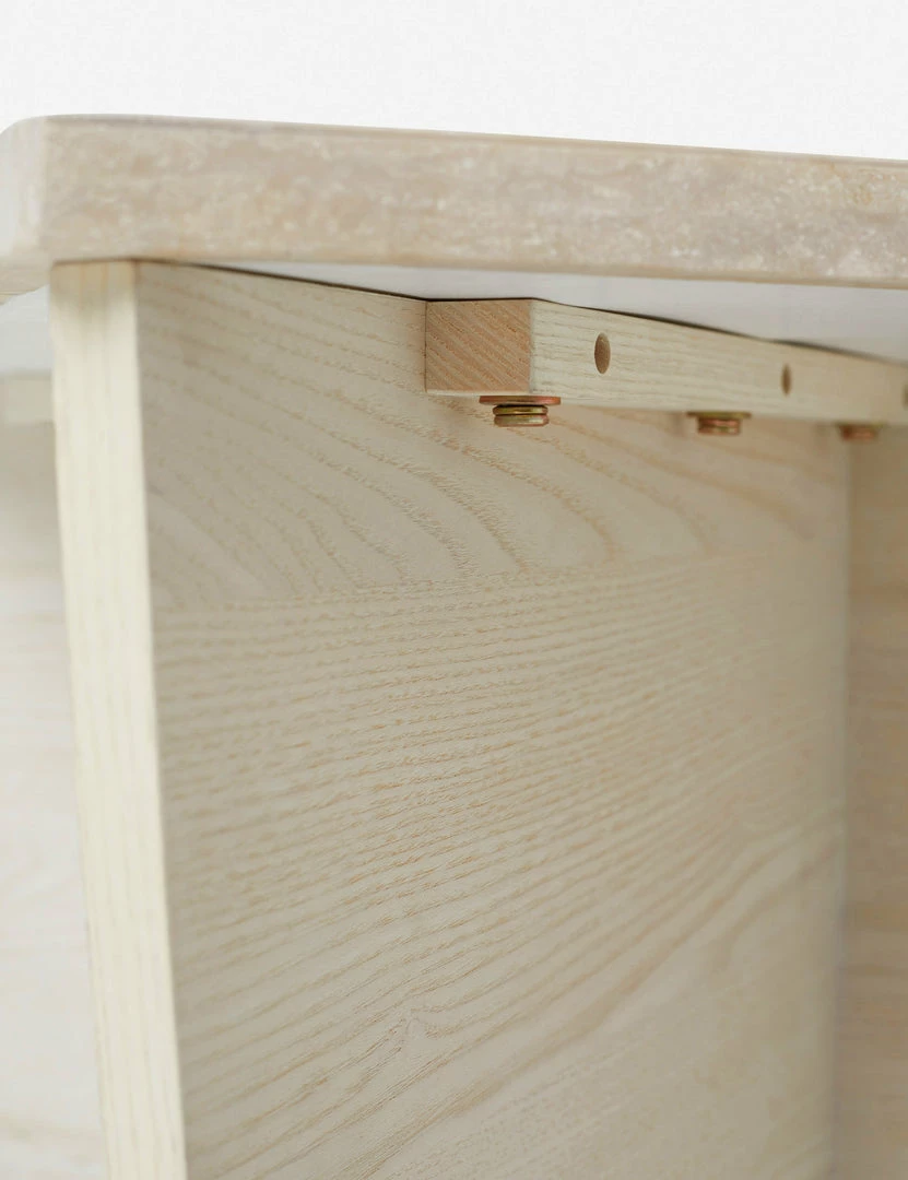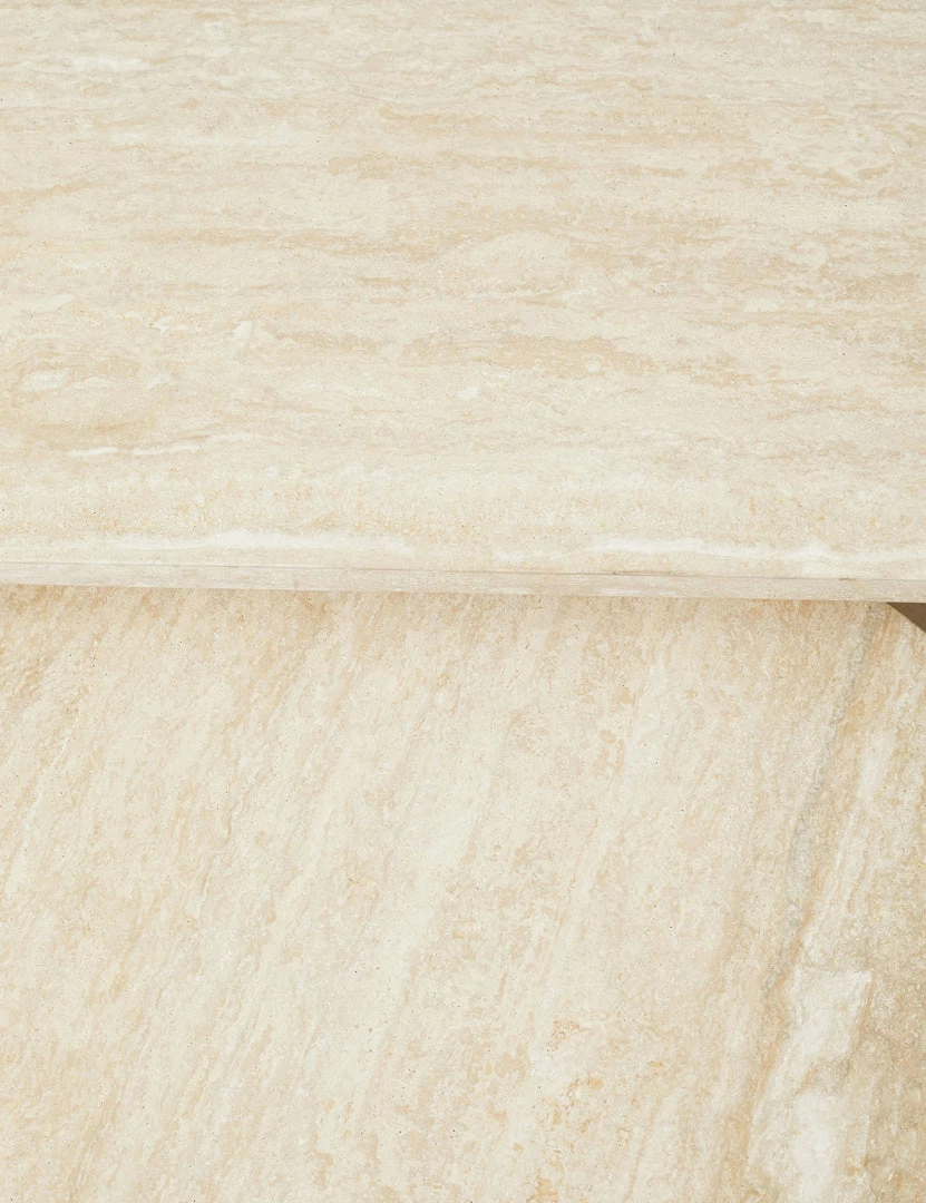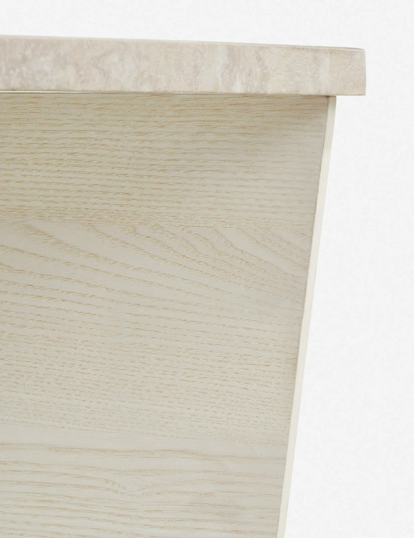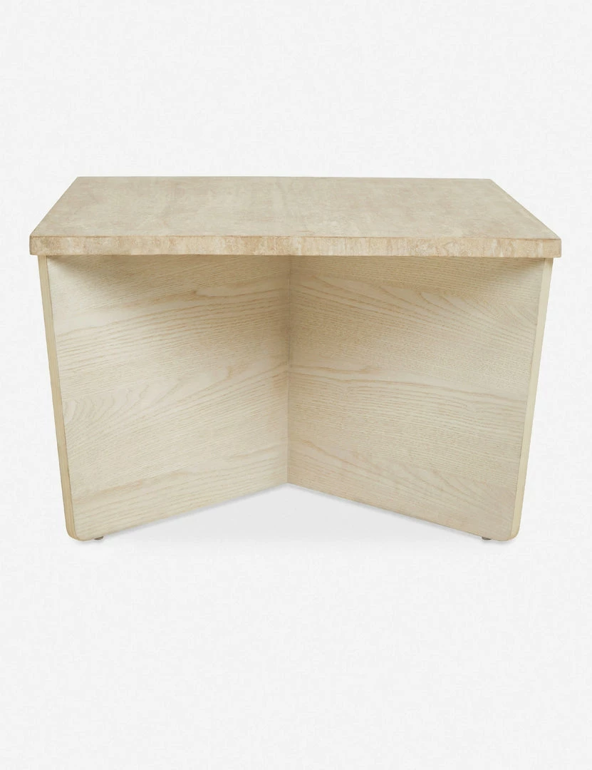 Architectural shapes stunningly highlight the natural materials of ash wood and travertine with this square coffee table. The warm, earth-toned coloring of the travertine top provides a soft, tonal contrast to its x-shaped ash veneer base.