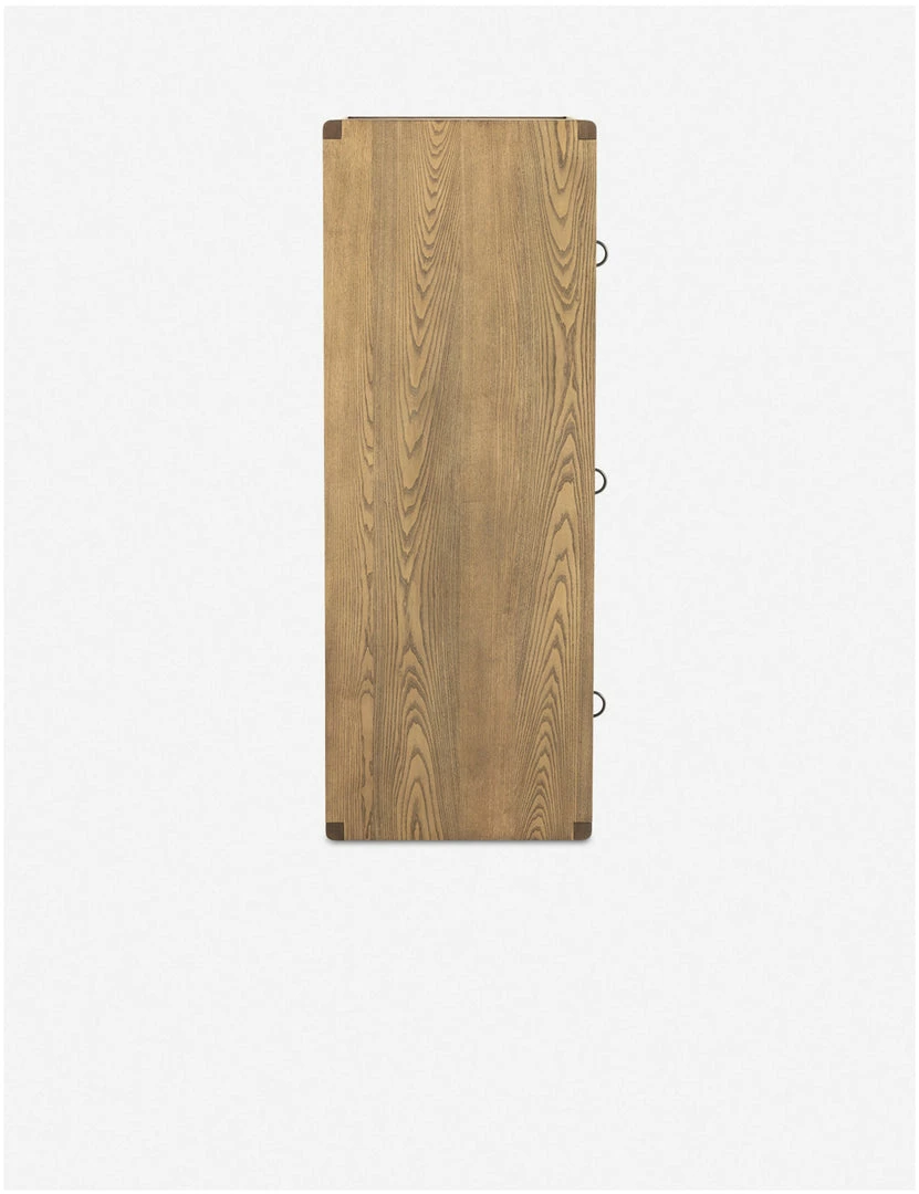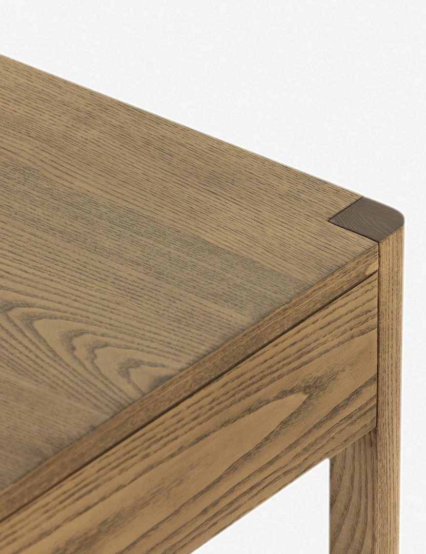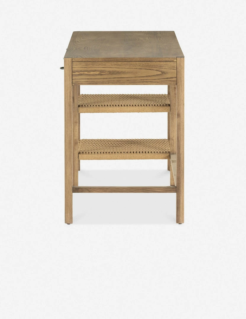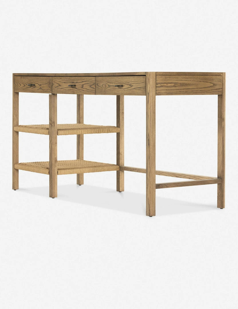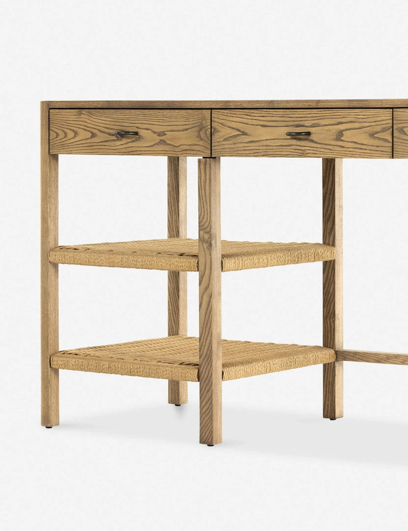 A clean-cut, ash wood design brings Danish-inspired warmth to this Laird desk. Iron arch pulls complete the look, while the woven cord shelves offer the perfect textural touch. Three drawers and the open shelves create ample storage with a streamlined wood frame you can style to your home office.