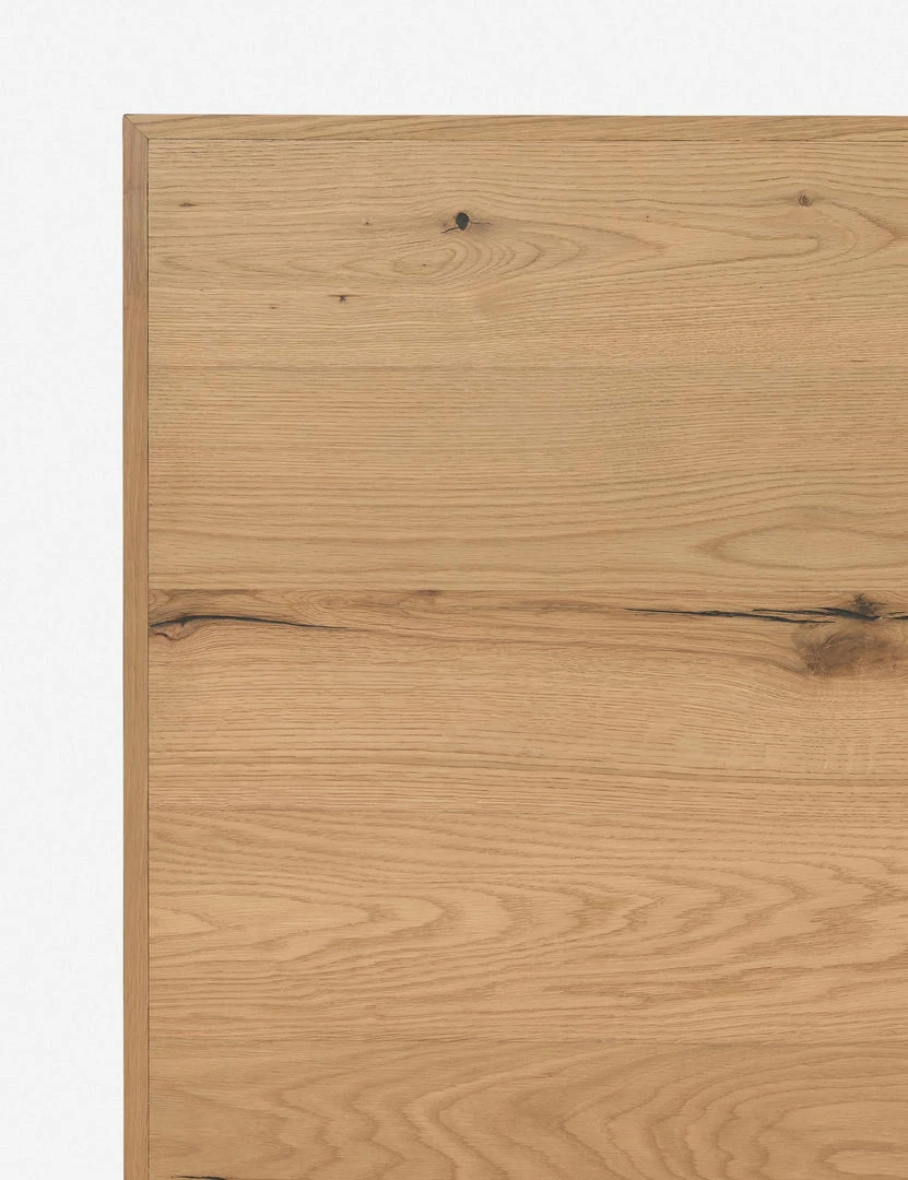 Organic texture meets refined style in this clean-lined bed frame clad in oak and finished with black resin to augment the graining and character of the wood. The rich grain surfaces of this bed frame with headboard design offer an irresistible layer of natural appeal that will pair perfectly with woven linen bed sheets for a fresh bedroom feel.