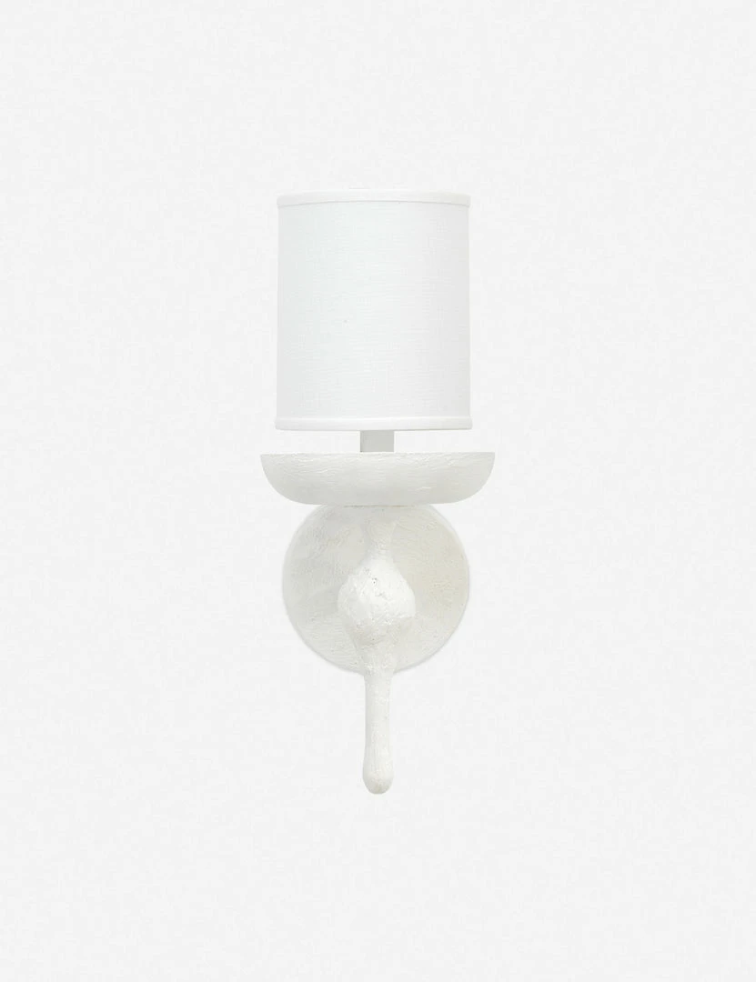 Artisanal charm is sculpted into the lines of this white plaster wall sconce, where traditional style meets modern design. Fitted with a smooth linen shade to complement the textured matte finish, this sconce is the perfect lighting accent.