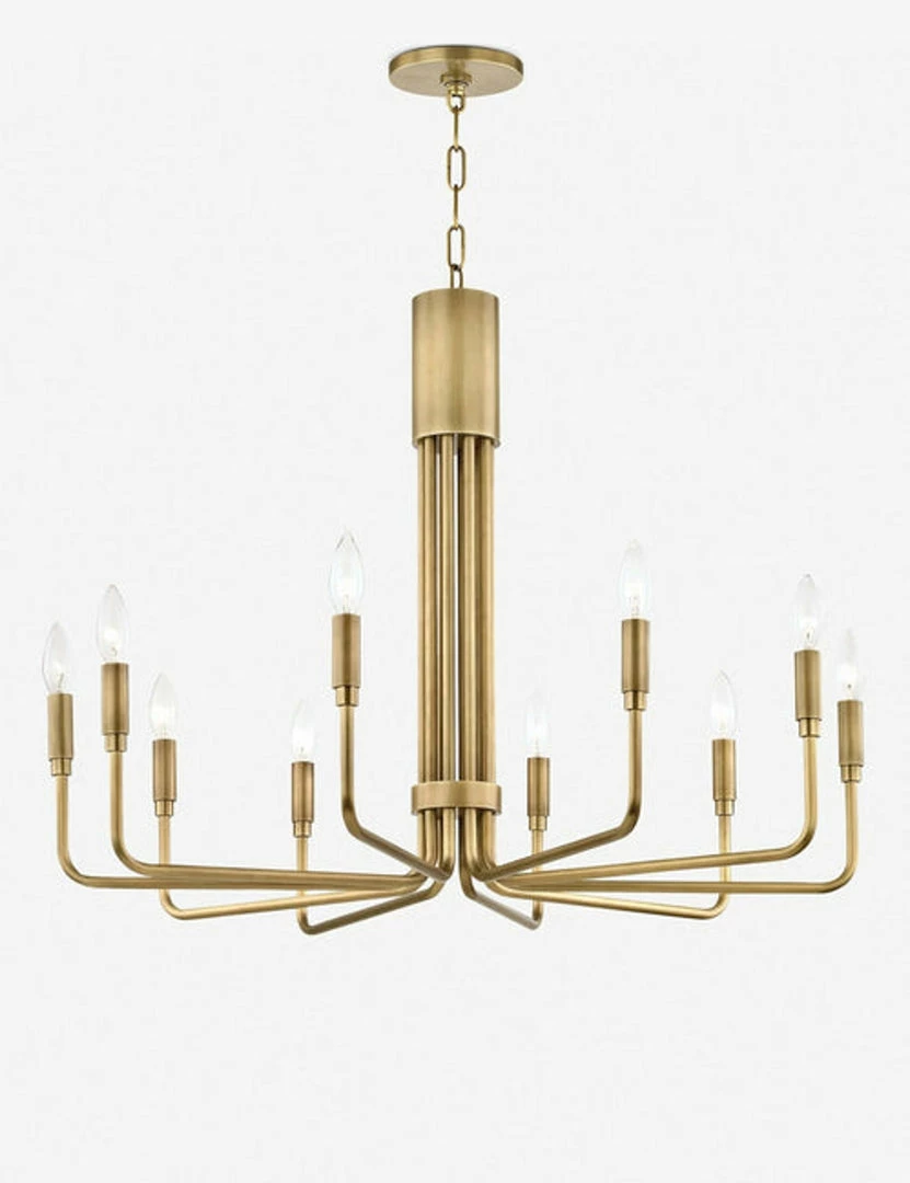 The ultimate finishing touch for any modern dining room, this aged-brass chandelier available with six or ten lights features a simplified traditional design and classic candelabra-style bulbs.