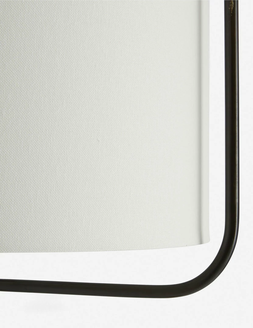 This lamp’s all about opposing design elements. Delicate lines and a simple shade juxtapose with industrial iron and antique brass finials, providing a contrast of shapes and finishes that stands out in a traditional space.