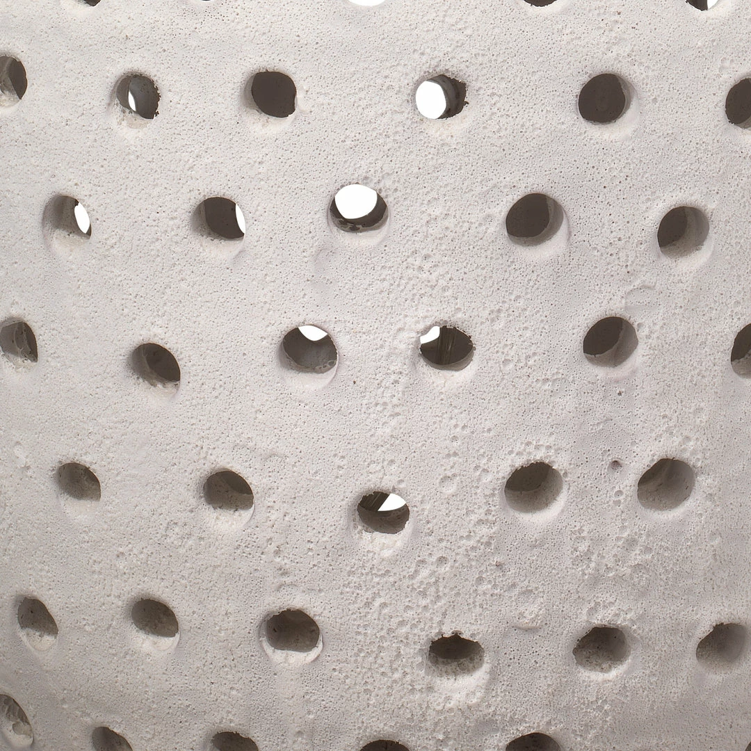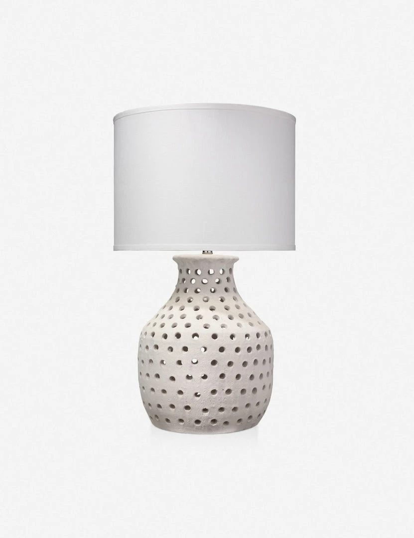 A simple, unrefined piece with some serious versatility, this perforated ceramic lamp adds a textural accent. Topped with a simple drum shade.