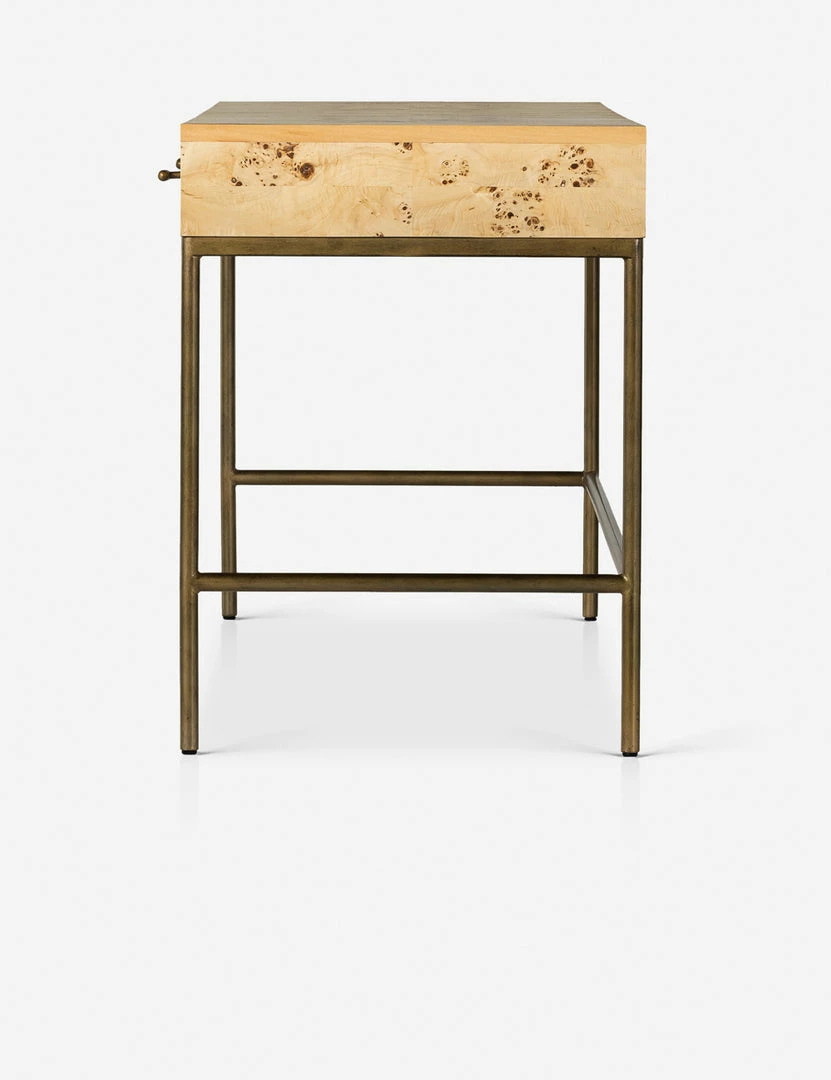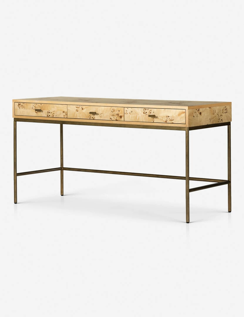 The Lorca Desk offers mixed material polish by pairing a poplar burl wood veneer with antique brass finished accents. Three drawers with t-shaped pulls and a slim iron frame balance the luxe tone with a grounded design to elevate an everyday home office workspace.