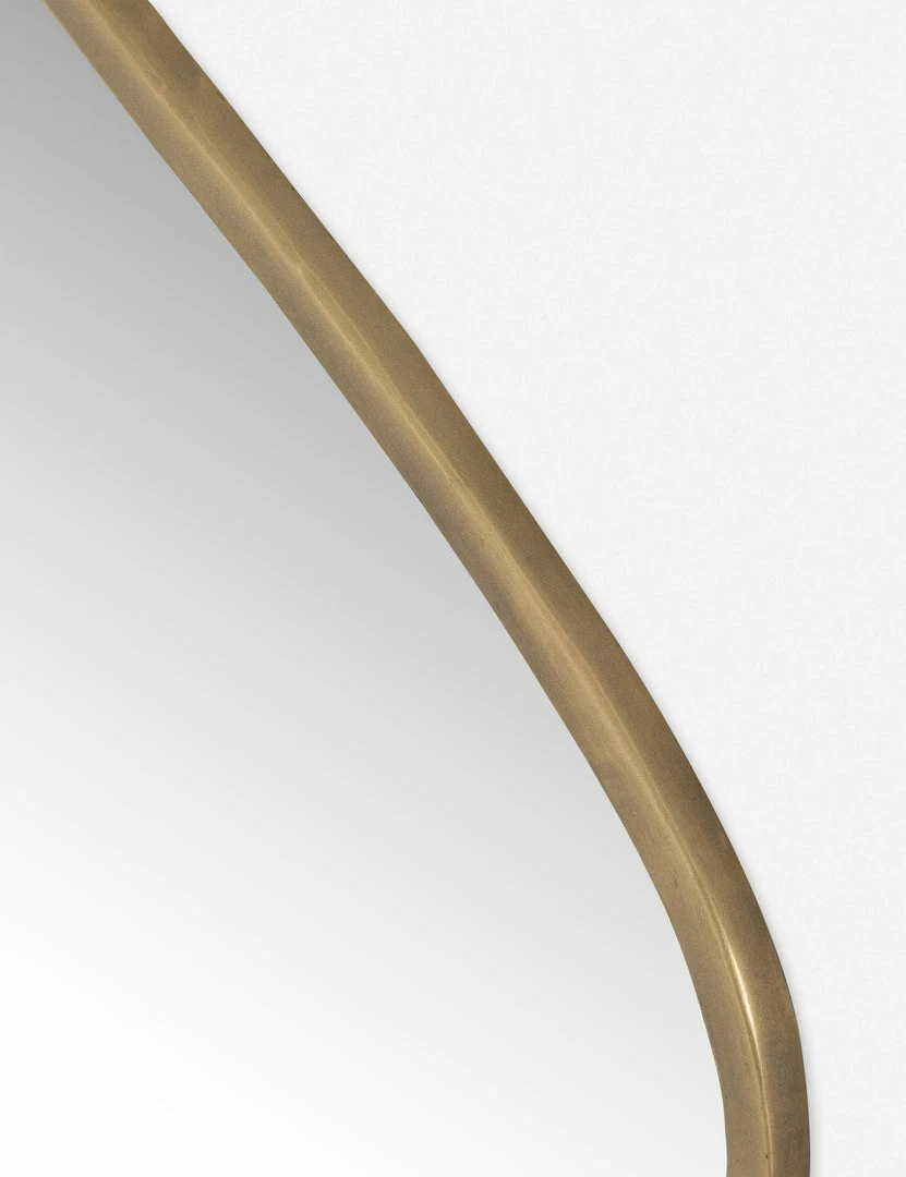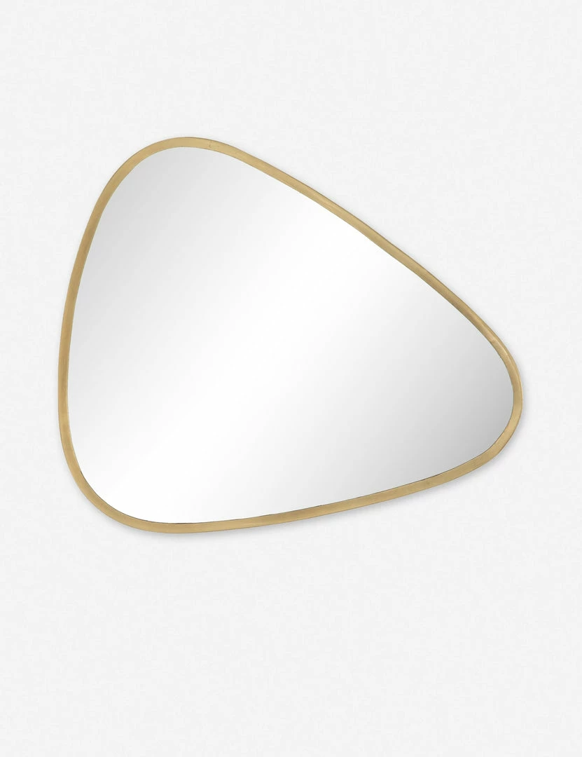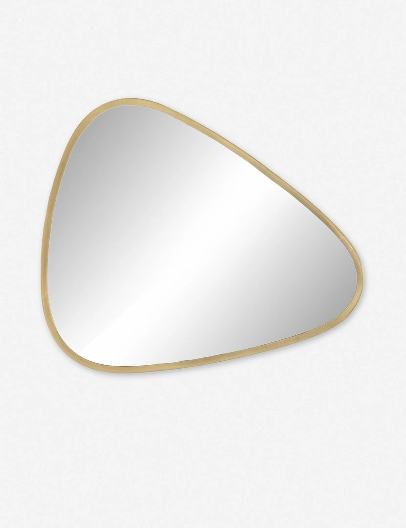 Update your bare walls with this modern mirror. Designed in a triangular shape with rounded corners and an antique brass frame, it’s the perfect way to add a little extra shine to your space.