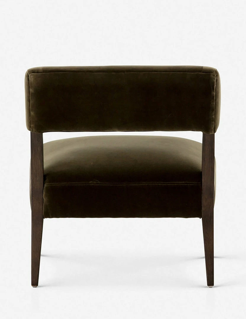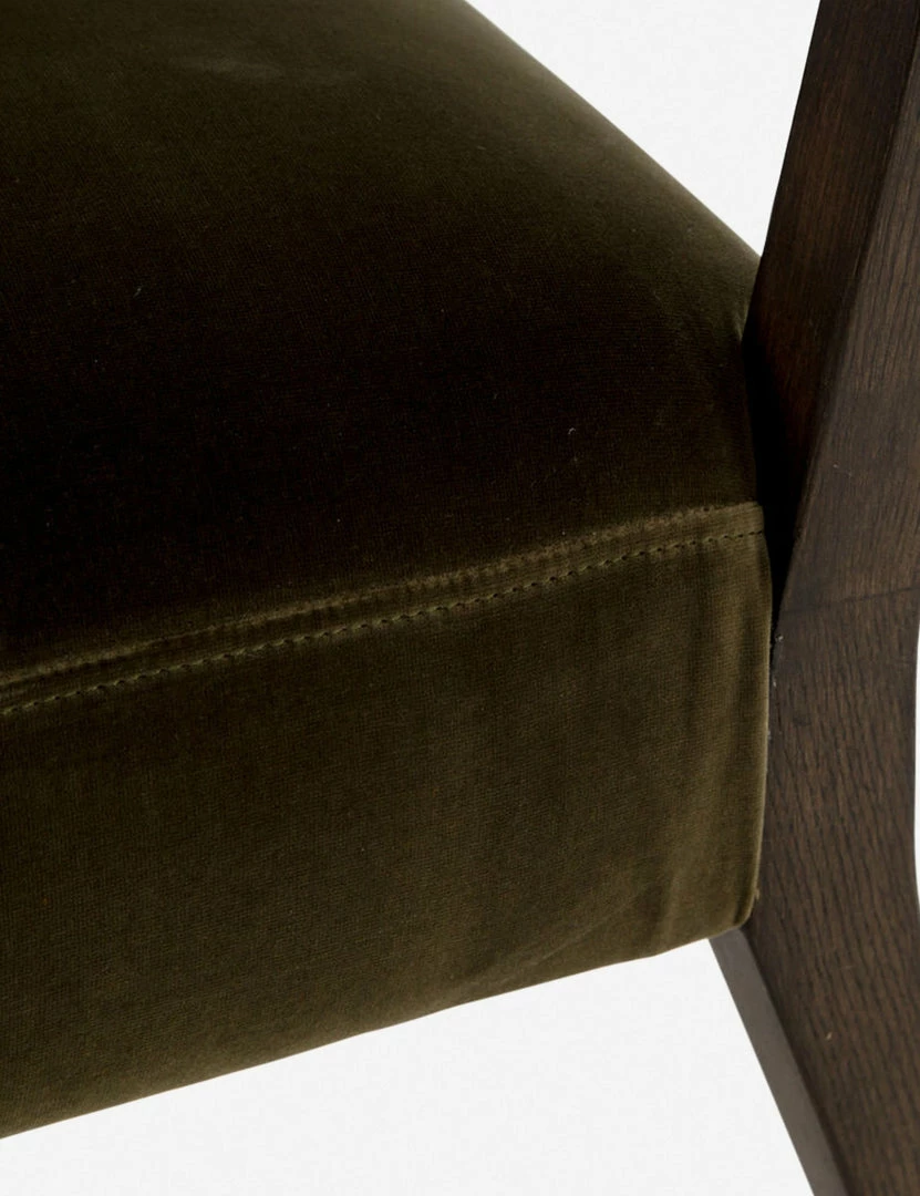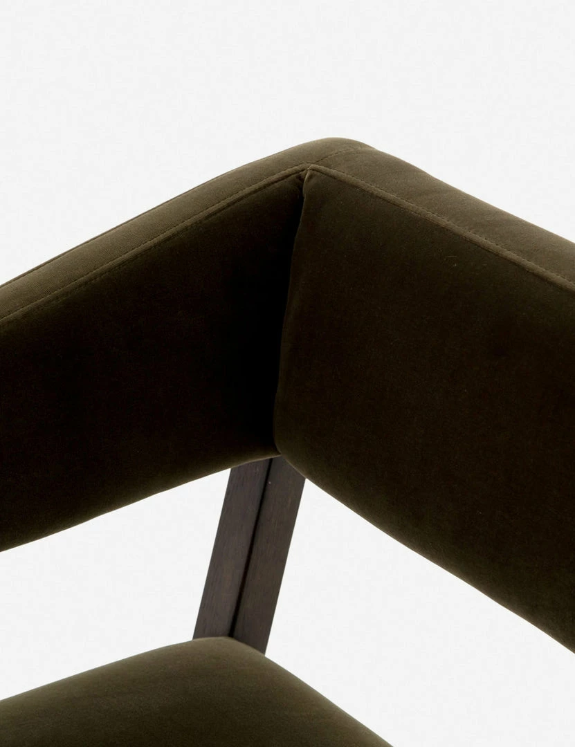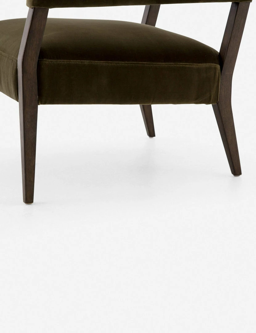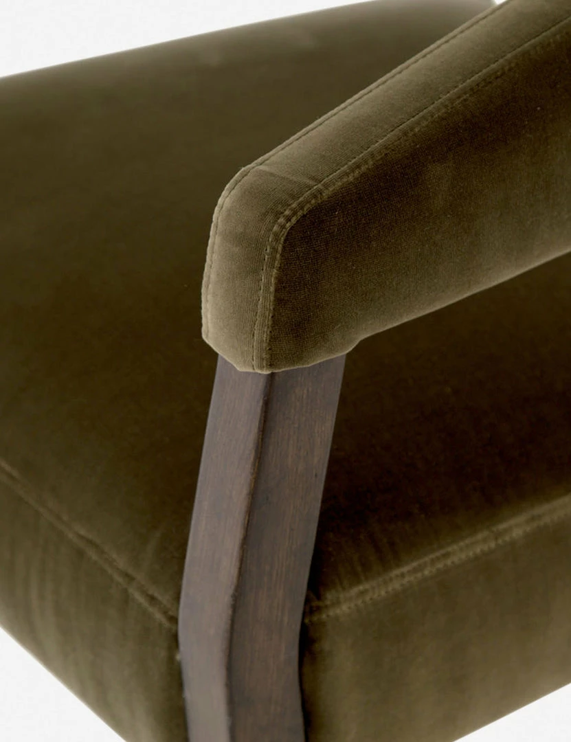 Combining rich oak wood and a deep olive velvet, this chair brings a luxe touch with mid-century style. Tapered legs and a squared back complete this inspired design.