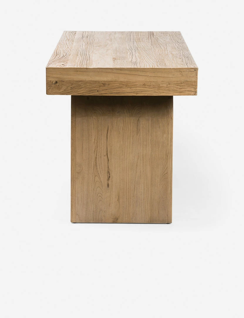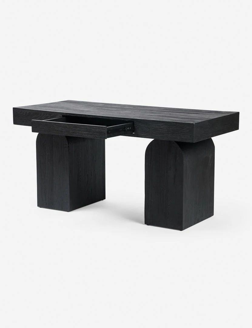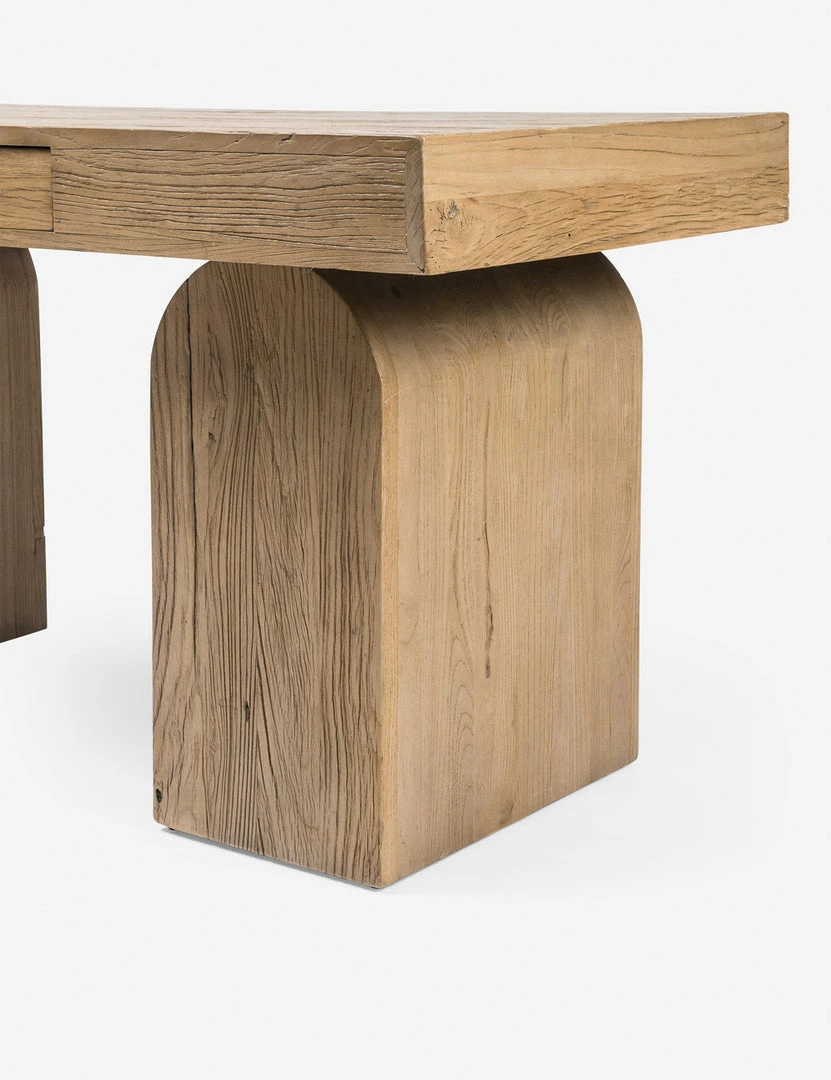 Elemental shapes create an architectural silhouette in this modern desk design. Fashioned from solid elm pieces with beautiful knotting and rich natural grain, two chunky arched legs hold a thick rectangular desktop featuring an inset drawer for sleek storage.