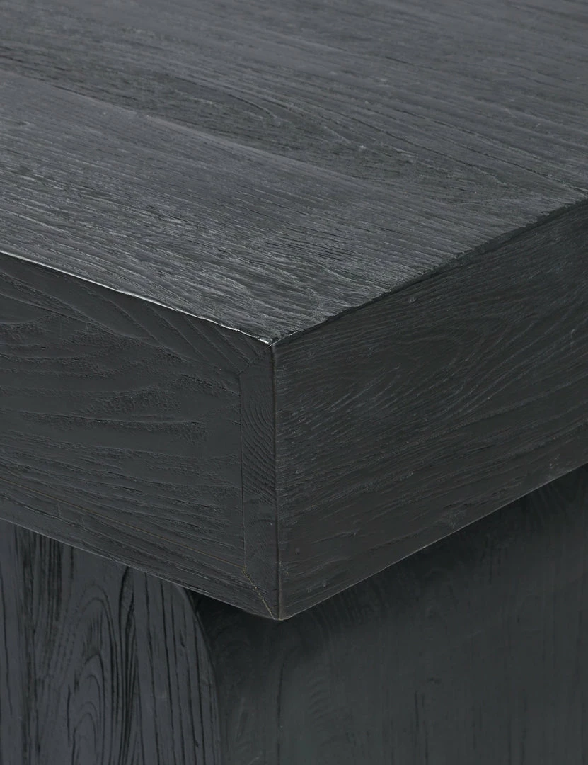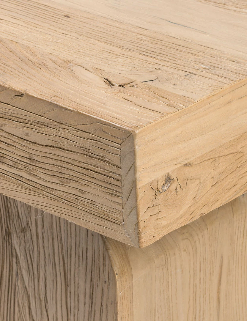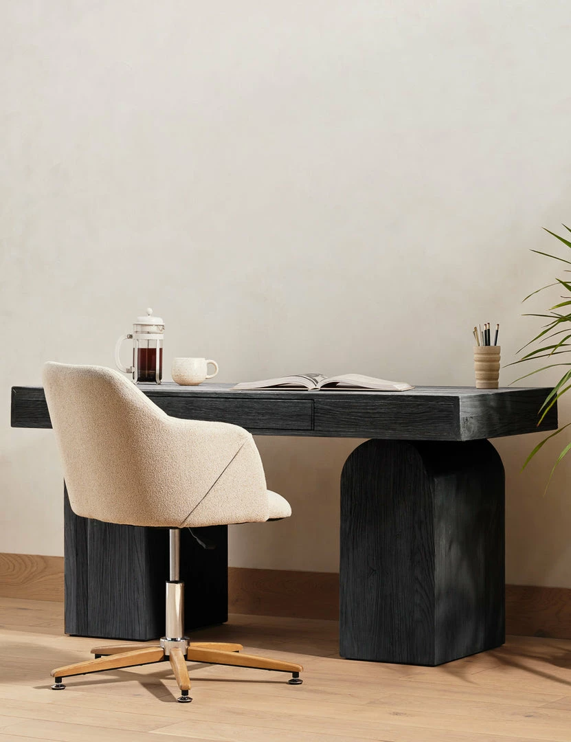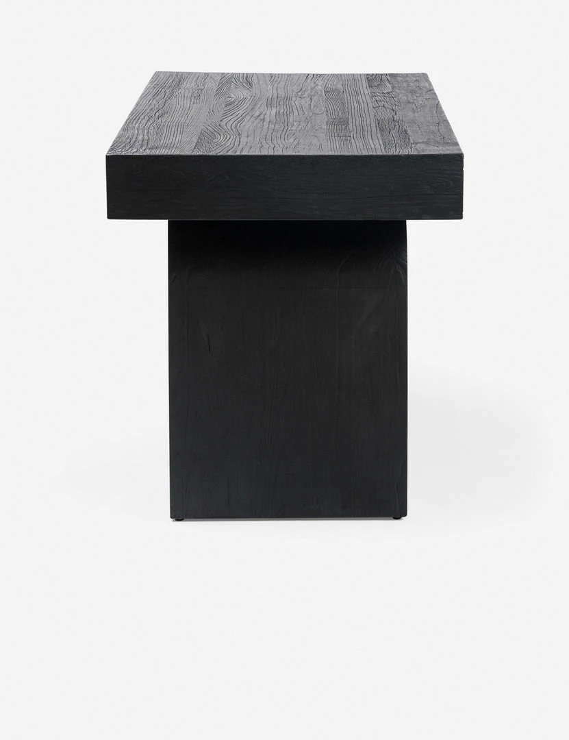 Elemental shapes create an architectural silhouette in this modern desk design. Fashioned from solid elm pieces with beautiful knotting and rich natural grain, two chunky arched legs hold a thick rectangular desktop featuring an inset drawer for sleek storage.