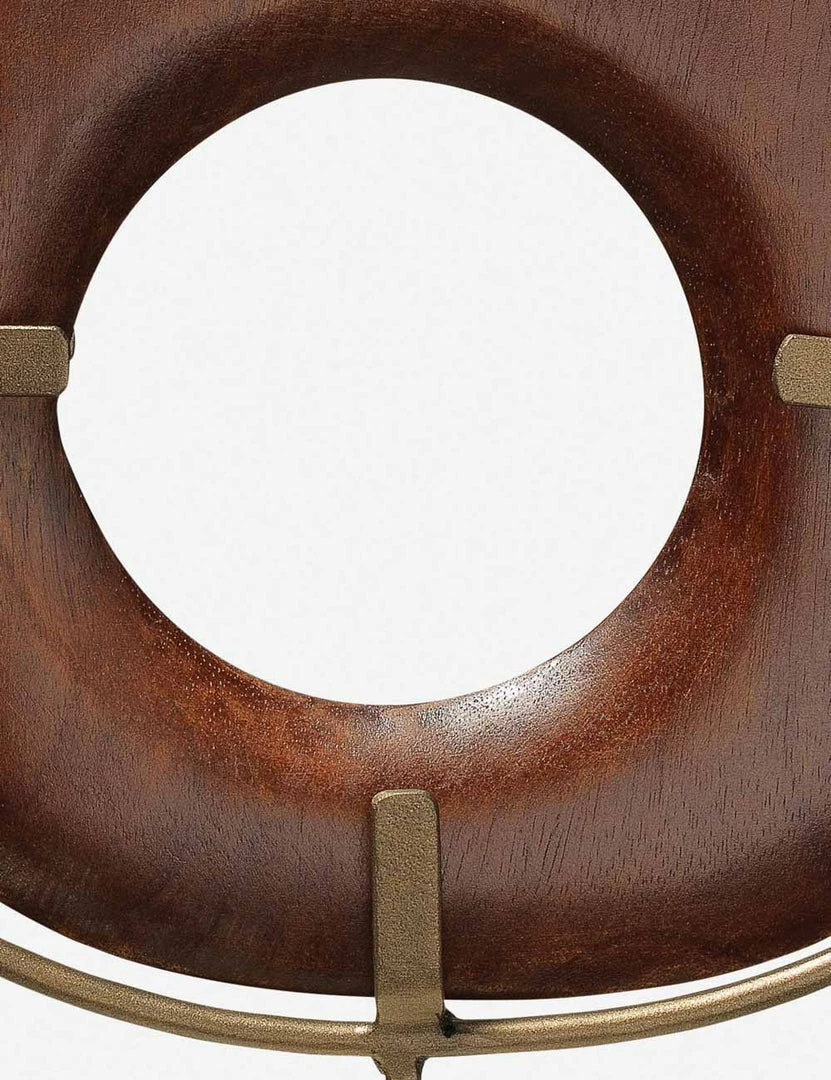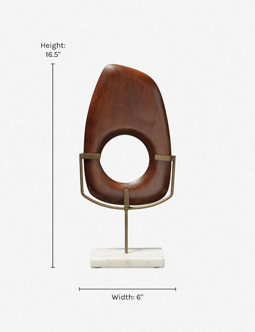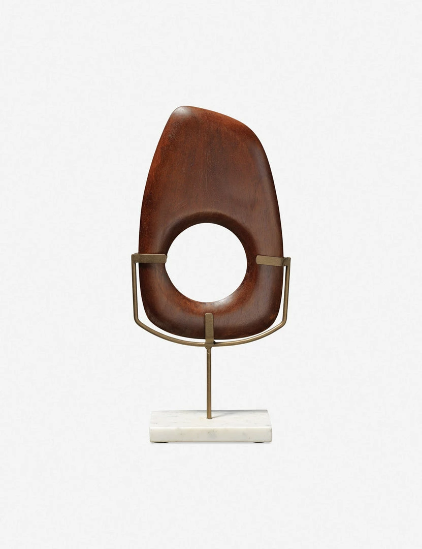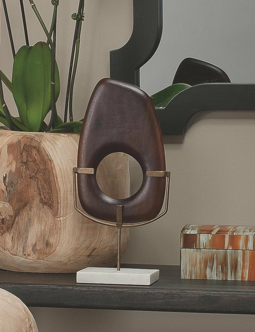 This dark-stained wood object offers stunning polish atop a marble and antique brass stand. Whether adorning a mid-century console or bringing dramatic appeal to your home office or workspace, this sculptural element is a signature statement.