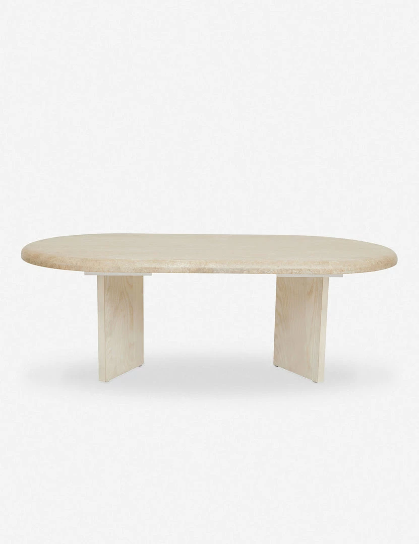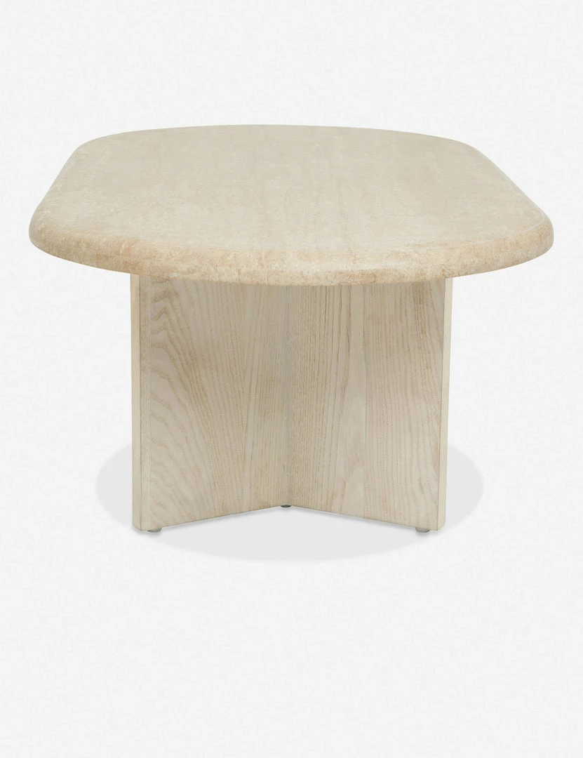 The sumptuously curved travertine top of this Marin Oval Coffee Table strikingly contrasts with the angular and almost delicate lines of its wood base. The warm, earth-toned coloring of the natural stone and pale finish of the ash veneer base complement each other for a tonal look. Pair your new coffee table with other deco-inspired furniture pieces and accents.