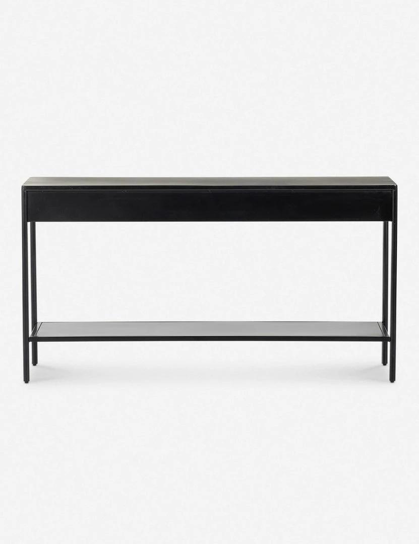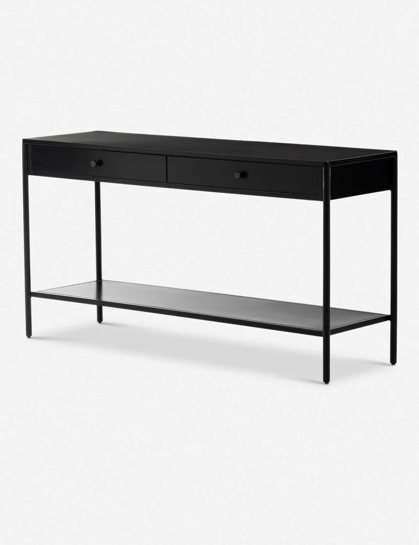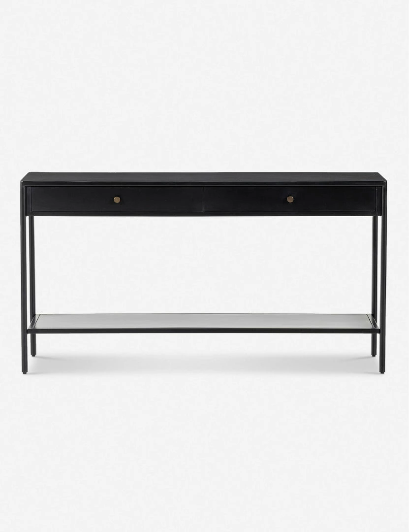 Blending sleek style with industrial undertones, this black-finished iron cabinet casts a clean, spare silhouette with bronzed hardware for modern appeal. Two drawers and a lower shelf offer a practical touch for a living room or entryway table.