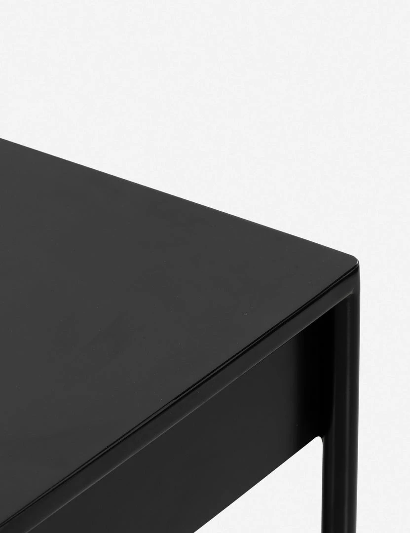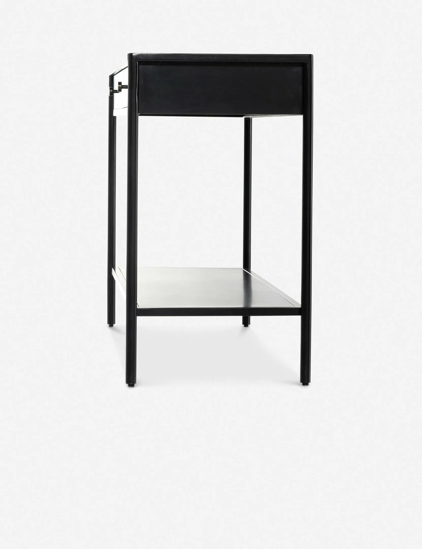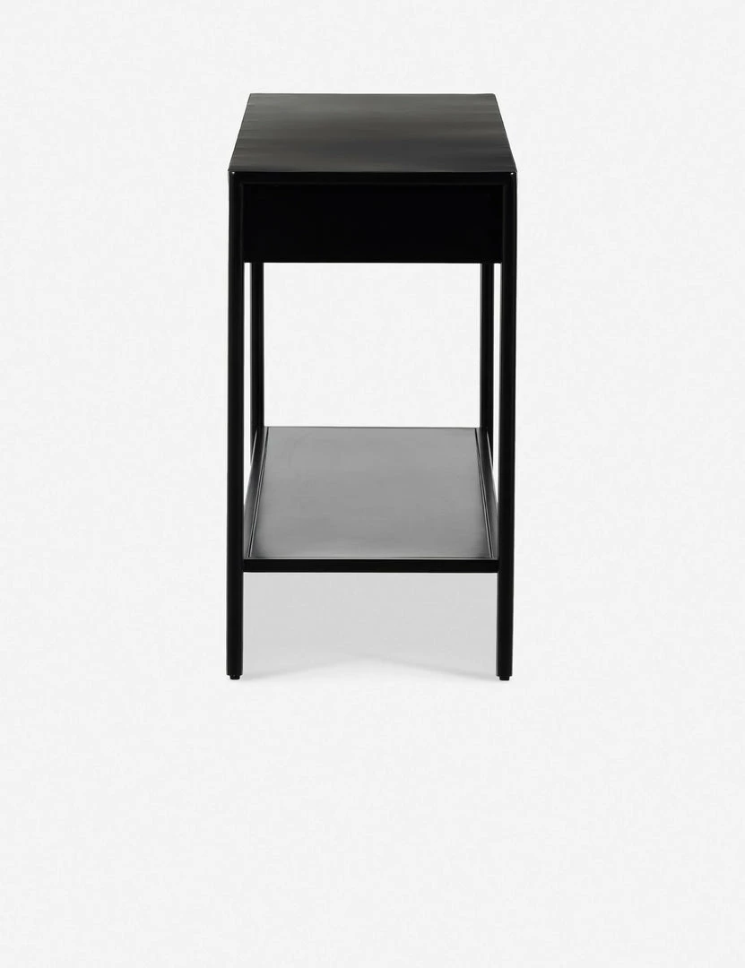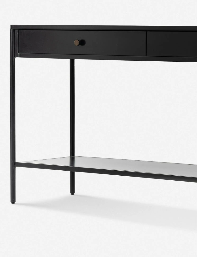 Blending sleek style with industrial undertones, this black-finished iron cabinet casts a clean, spare silhouette with bronzed hardware for modern appeal. Two drawers and a lower shelf offer a practical touch for a living room or entryway table.