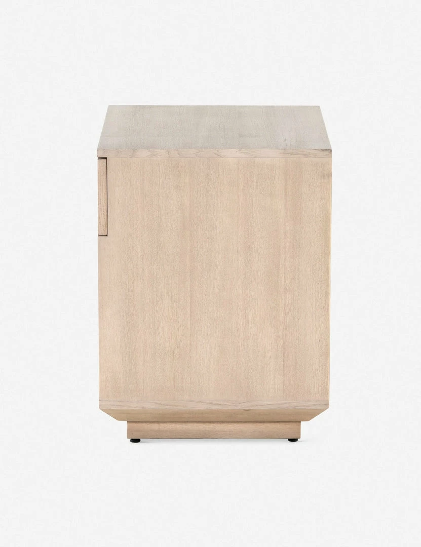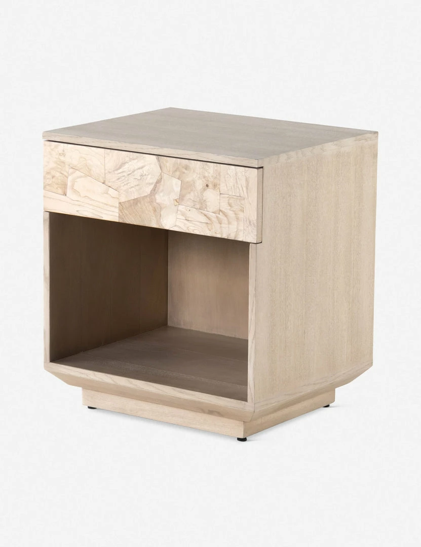 Evolve your bedroom’s aesthetic with this unique, handcrafted nightstand and its organic patchwork drawer front design, all cut and placed by hand. Atop a squared plinth base, white-finished mahogany encases its single bleached burl drawerΓ’β¬βwith a push-latch open adding a clean, seamless look. We love layering this statement-making nightstand into a space with other luxe neutrals.