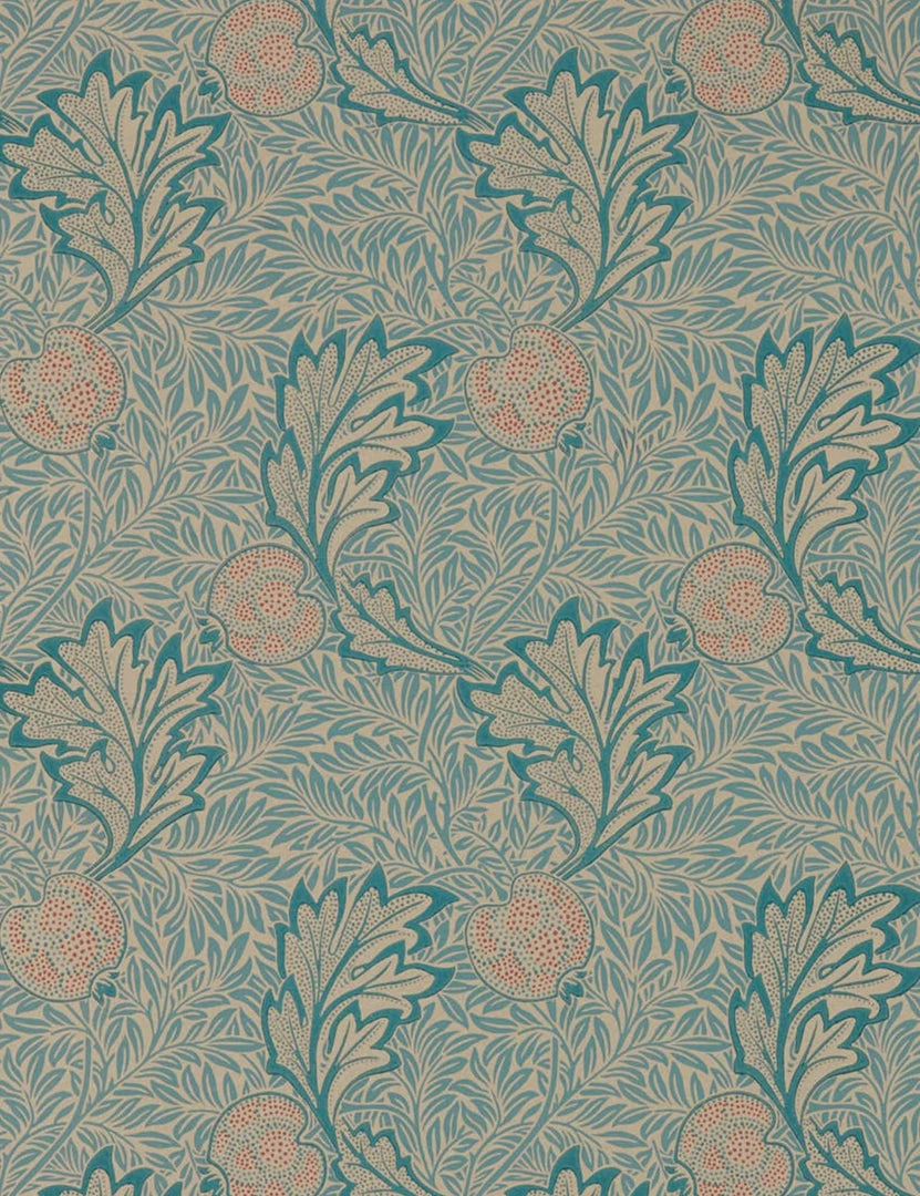 Scrolling acanthus leaves and freckled apples are the prominent focal points of this refreshing wall art. Designed in the late 19th century by Arts & Crafts textile designer William Morris, this wallpaper was used to decorate his daughter’s workroom in her Hammersmith home located in London, England. The “Acanthus” motif holds particular value as it was the first pattern released by Morris & Co. in 1884. It holds the title for the designers most recognizable pattern due to its intricate layering of entangled foliage and its three dimensional character.